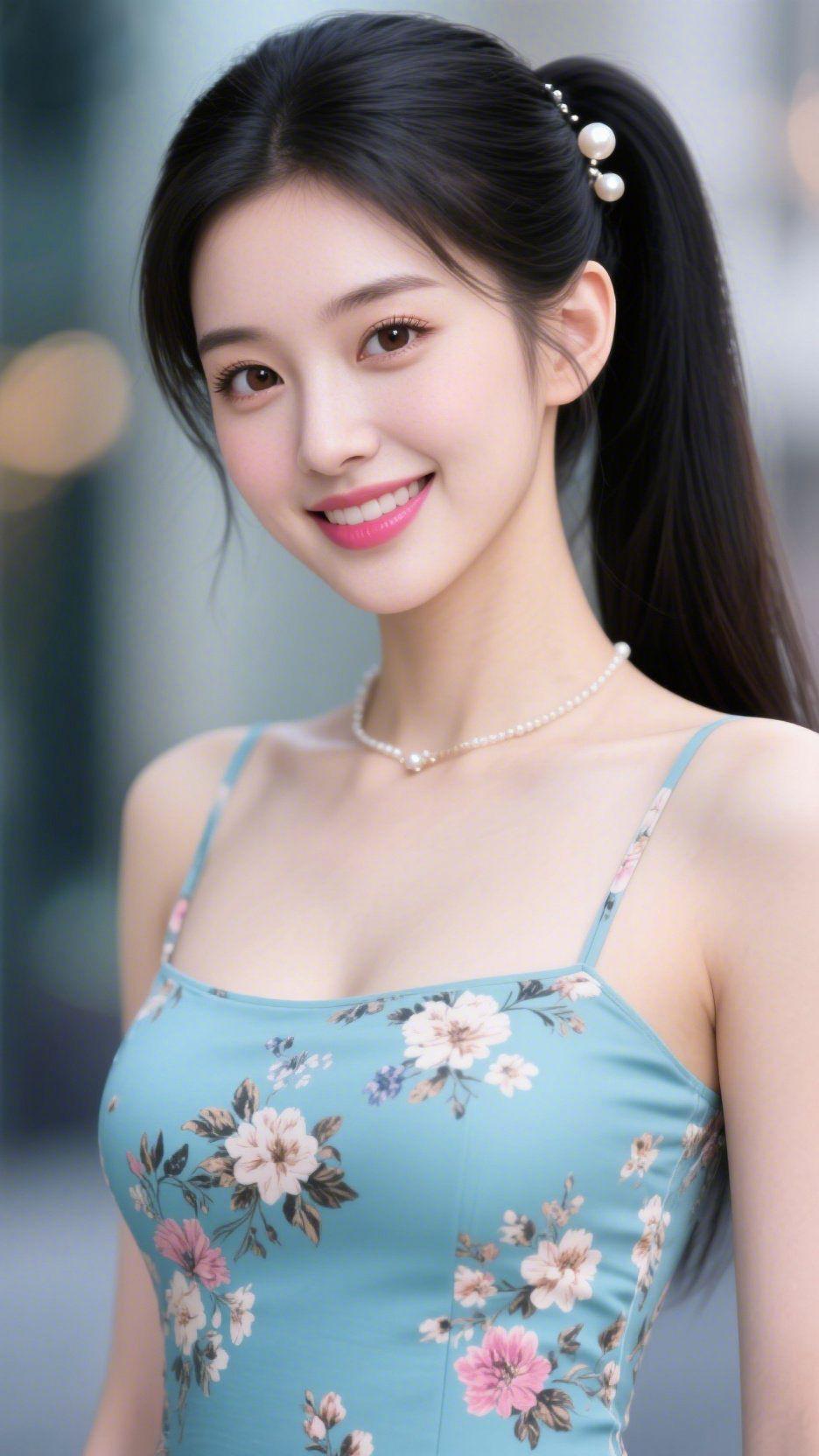 青裙载花遇轻风 街巷的风裹着软意漫过时,她正立在浅光里浅笑。 青蓝裙身缀着粉白碎花,像把春野的柔融在衣料中,随轻缓姿态舒展成淡软的模样;发间珍珠饰泛着润亮,与颈间珠链相衬,整个人浸在温雅的气息里。 她笑起时,唇色是花尖的明丽,眼尾裹着软,像把街巷的闲静收进了眼眸。光落裙身的片刻,花影与珠饰的柔相融,将这寻常街景的瞬间,晕成了能落进心里的甜。 原来日常的美好从不是刻意妆点,是衣间的花、发梢的亮,把普通瞬间,酿成了心上不散的温软。 青裙花意 珠饰温雅