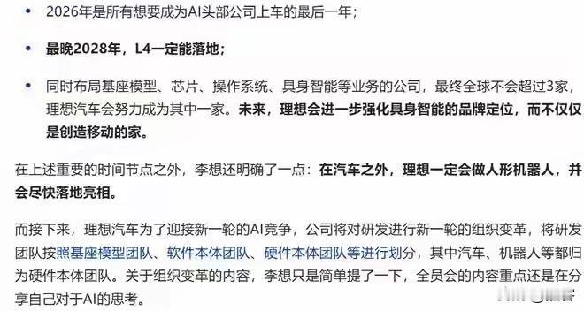理想汽车将进军人形机器人领域。这是理想汽车战略大转型,李想强调理想不再追求“移动的家”概念,转而面向AI和具身智能领域发展。 这对面对华为鸿蒙智行大有一统新能源汽车行业的情况下,理想汽车的战略大转移确实有点意料之外又在情理之中。 令人意外的是率先提出“移动的家”概念的理想汽车居然放弃了这一目标,并且做得非常成功,要知道这个目标是目前中国新能源众多车企竞相想要奋斗的方向。 情理之中是目前新能源赛道竞争的底层逻辑就是AI,无论是自动驾驶还是机器人,都是AI大模型的应用,小鹏如此,华为如此,行业领头羊特斯拉更是如此。