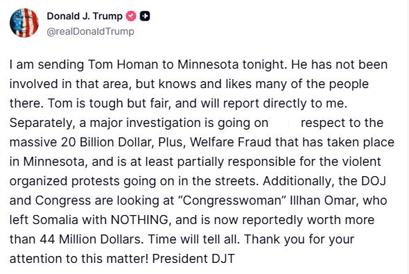 🔻特朗普:“我今晚将汤姆·霍曼派往明尼苏达州。他此前未曾涉足该地区,但认识并喜欢那里的许多人。汤姆为人强硬但处事公正,并将直接向我汇报。”🔻汤姆·霍曼就是那个“边境沙皇”,特朗普的边境事务主管。🔻via realdonladtrump牢a谈美国ice暴力执法争议热点现场海外新鲜事