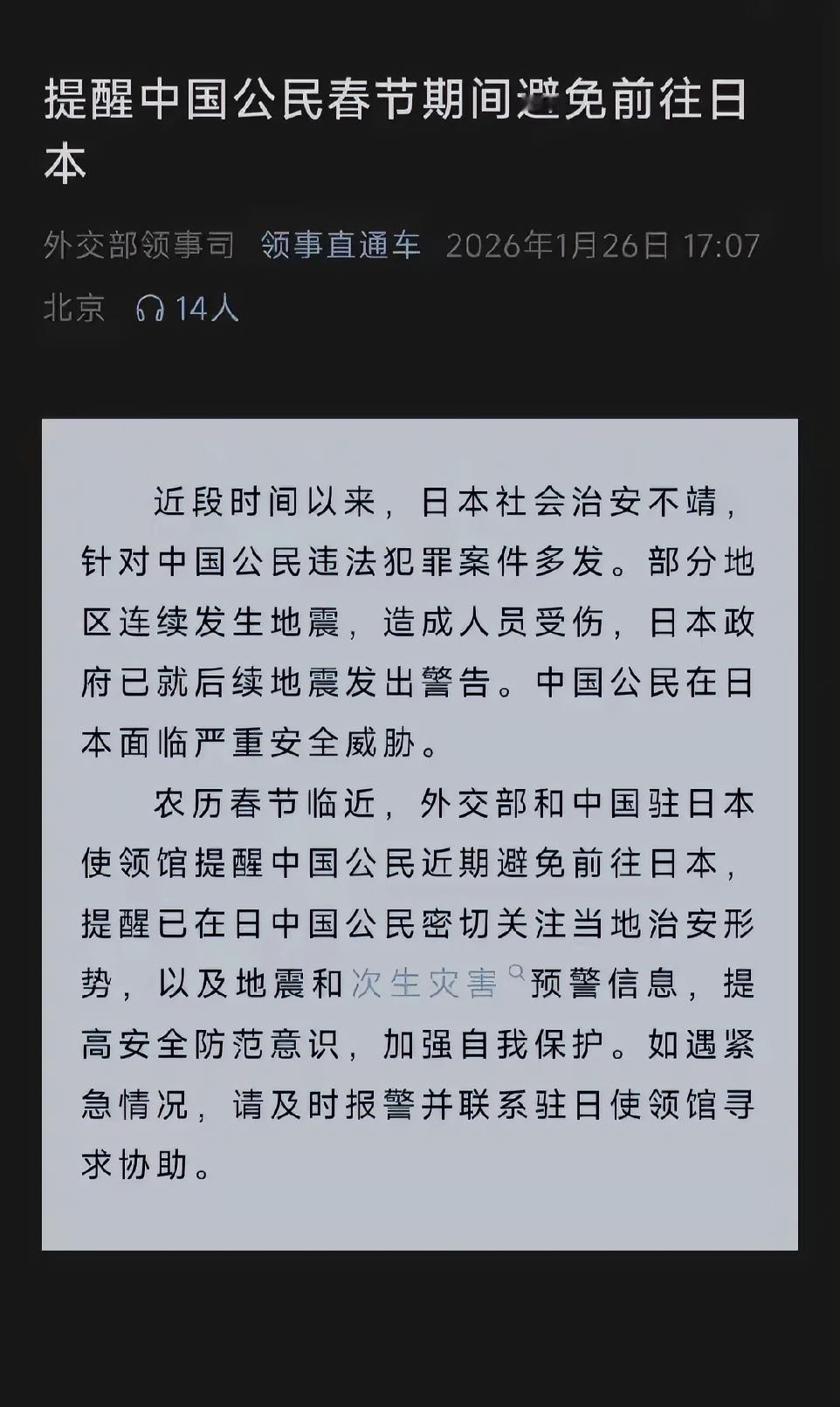 谁说不是日本人就影响不了日本大选?咱也给高市上点强度,春节避免前往日本。 以上都是玩笑。 主要还是现在去日本旅游太危险了。 一是日本国内右翼主义分子猖獗,整体社会治安不是太好。 二是日本地壳运动比较活跃,灾害发生可能性也很高。 1月26日外交部再次发出了预警:提醒中国公民避免前往日本。 再说现在去日本的中国人明显减少,中国人在别国人群里就会很突出,真遇到那些右翼分子闹事,受到伤害的概率大很多,还是小心为妙。