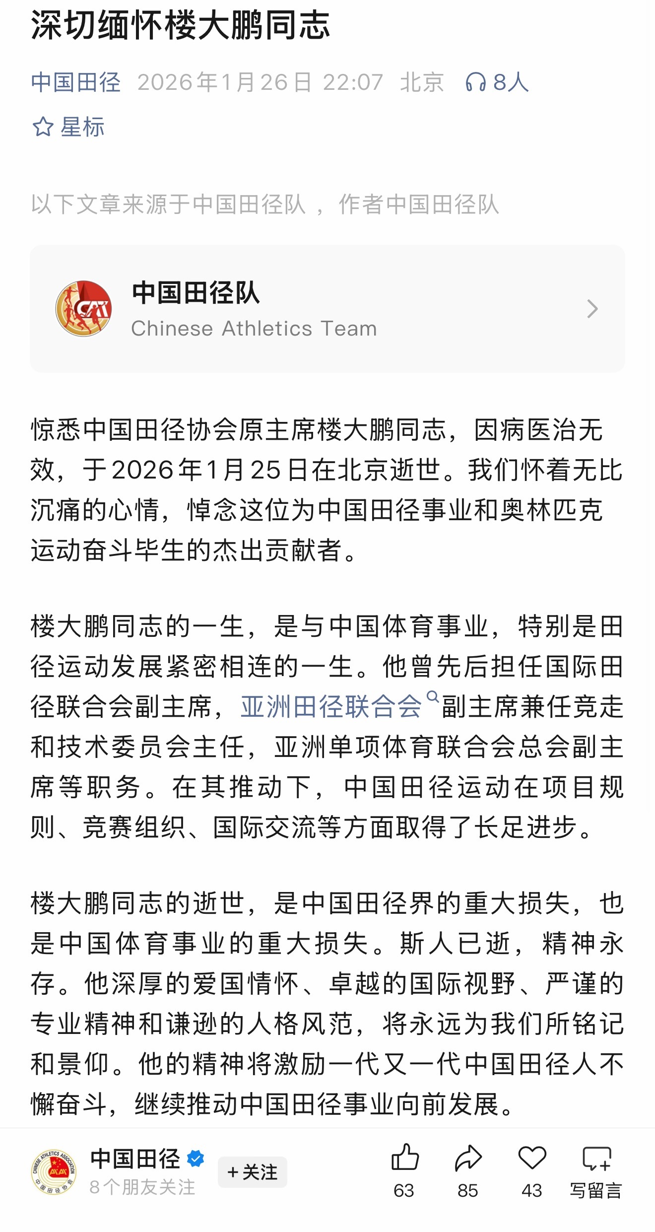 【#中国田协悼念楼大鹏#】 1月26日深夜,中国田径协会发文,深切缅怀楼大鹏同志。惊悉中国田径协会原主席楼大鹏同志,因病医治无效,于2026年1月25日在北京逝世。我们怀着无比沉痛的心情,悼念这位为中国田径事业和奥林匹克运动奋斗毕生的杰出贡献者。楼大鹏同志的一生,是与中国体育事业,特别是田径运动发展紧密相连的一生。他曾先后担任国际田径联合会副主席,亚洲田径联合会副主席兼任竞走和技术委员会主任,亚洲单项体育联合会总会副主席等职务。在其推动下,中国田径运动在项目规则、竞赛组织、国际交流等方面取得了长足进步。楼大鹏同志的逝世,是中国田径界的重大损失,也是中国体育事业的重大损失。斯人已逝,精神永存。他深厚的爱国情怀、卓越的国际视野、严谨的专业精神和谦逊的人格风范,将永远为我们所铭记和景仰。他的精神将激励一代又一代中国田径人不懈奋斗,继续推动中国田径事业向前发展。沉痛悼念并深切缅怀楼大鹏同志!中国田径协会2026年1月26日