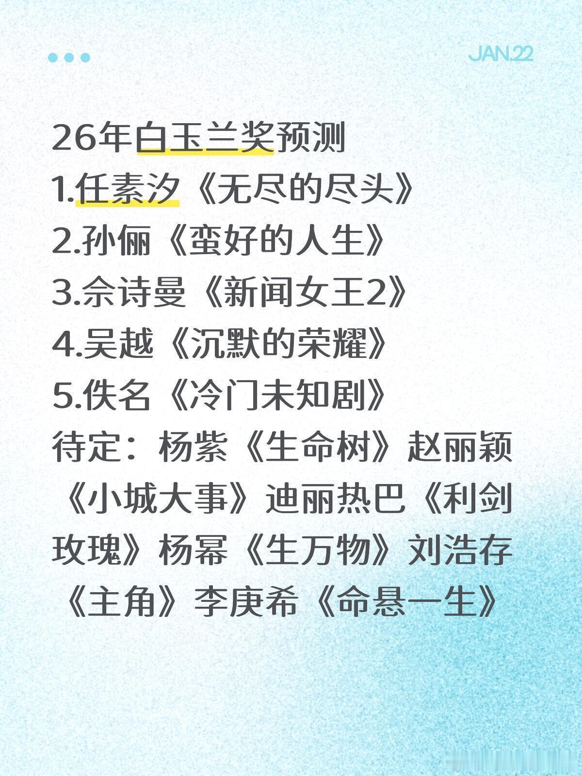 26年白玉兰奖预测1.任素汐《无尽的尽头》2.孙俪《蛮好的人生》3.佘诗曼《新闻女王2》4.吴越《沉默的荣耀》5.佚名《冷门未知剧》待定:杨紫《生命树》赵丽颖《小城大事》迪丽热巴《利剑玫瑰》杨幂《生万物》刘浩存《主角》李庚希《命悬一生》白玉兰奖|