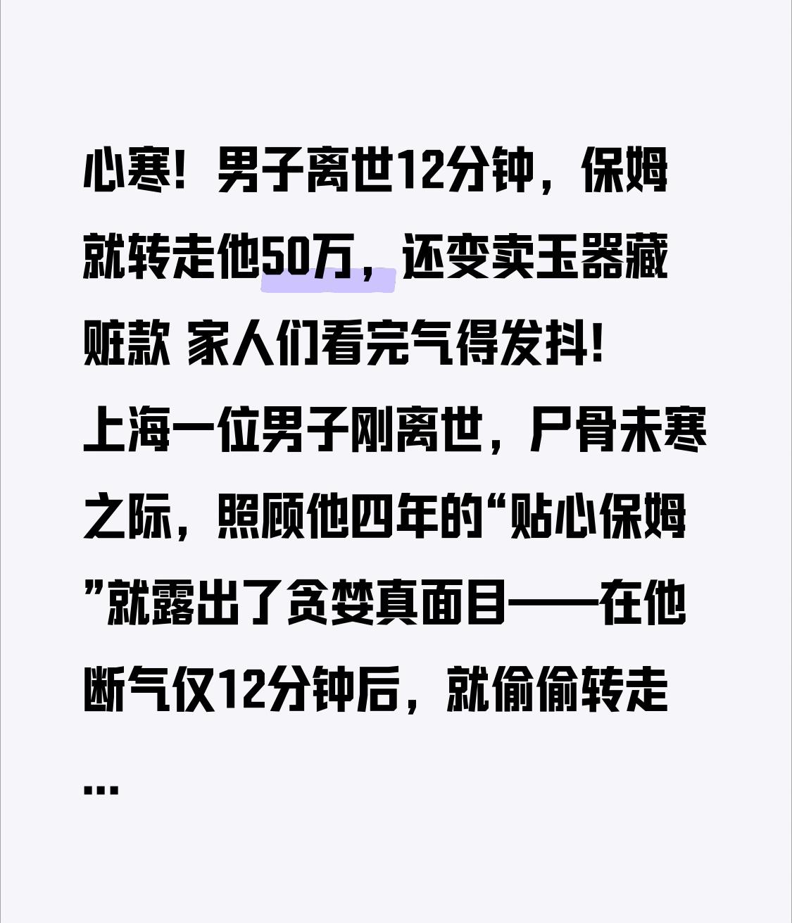 心寒!男子离世12分钟,保姆就转走他50万,还变卖玉器藏赃款 家人们看完气得发抖!上海一位男子刚离世,尸骨未寒之际,照顾他四年的“贴心保姆”就露出了贪婪真面目——在他断气仅12分钟后,就偷偷转走账户10万,两天内狂卷50万,还把家里的玉器偷偷变卖,把雇主的信任踩在脚下,这操作简直刷新三观! 事情要从张先生的悲剧说起。张先生常年独居,四年前通过中介请来保姆刘某照顾起居,平日里待她不薄,因为自己行动不便,连手机支付密码都没设防,日常开销全靠刘某帮忙操作,把她当成了可以信赖的家人。刘某表面上勤恳贴心,把张先生照顾得无微不至,家人也放心把独居的他托付给她,谁都没料到,这份信任背后藏着一颗毒蛇般的心。 转折点发生在张先生离世当天。9时33分,张先生因病去世,家人还沉浸在悲痛中料理后事,可谁能想到,9时45分——仅仅过了12分钟,刘某就拿着张先生的手机,熟练地点开转账软件,先转走10万到自己账户,又从ATM机取走1万现金。第二天,她更是肆无忌惮,分笔转走29万,短短两天就卷走50万存款。更过分的是,她还趁家人不备,偷偷拿走张先生两处住宅里的玉器,找渠道变卖获利,事后还试图删除所有转账记录和银行短信,想神不知鬼不觉地吞掉这笔遗产。 可她千算万算,没料到张先生的姐姐张女士在整理弟弟遗物时,发现银行账户流水不对劲。明明人已经去世,却还有大额转账支出,张女士立刻报警。警方顺着交易记录一查,所有线索都指向保姆刘某。面对铁证,刘某不得不坦白:“我知道他的支付密码,想着他没子女,家人可能不会仔细查账,就想占点便宜。” 更让人愤怒的是,刘某并非一时冲动。她在张家做了四年保姆,早就摸清了张先生的财产状况和家庭情况,甚至知道他没立遗嘱,才敢在他离世后立刻动手。要知道,张先生的遗产本该由年迈的母亲继承,这50万是老人晚年的养老钱,刘某的行为不仅违背道德,更触犯了法律。根据《民法典》规定,她无权处置不属于自己的遗产,其行为已构成盗窃罪,目前已被警方刑事拘留,等待她的将是法律的严惩。 其实这类案件并非个例,深圳曾有保姆29次偷转老人25万,温州保姆两个月偷走雇主30万财物,这些保姆都是靠着雇主的信任,一步步蚕食他人财产。他们利用老人或独居者的不便,掌握支付密码、熟悉财产情况,用删除记录、小额多次转账等方式掩人耳目,可终究逃不过法律的制裁。 信任是雇佣关系的基石,雇主把生活甚至财产托付给保姆,换来的不该是背后捅刀。这件事也给大家提了个醒:不管是请保姆还是照顾独居亲人,财产安全一定要多留个心眼,支付密码不要轻易泄露,重要财物要妥善保管,必要时可以安装监控、定期核查账户。别让善意被利用,别让信任变成别人伤害你的利器。 如果你是张先生的家人,会怎么处理这件事?你觉得该如何防范这类风险?评论区聊聊你的看法,也别忘了转发给身边有老人的家庭,一起避坑!