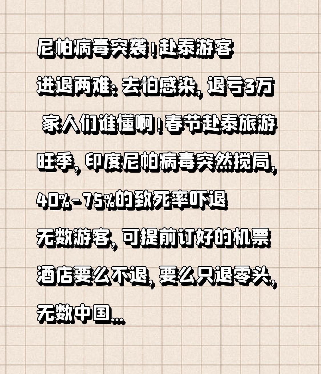尼帕病毒突袭!赴泰游客进退两难:去怕感染,退亏3万 家人们谁懂啊!春节赴泰旅游旺季,印度尼帕病毒突然搅局,40%-75%的致死率吓退无数游客,可提前订好的机票酒店要么不退,要么只退零头,无数中国游客陷入“保健康亏钱财”的两难境地,有人直接亏了3万多,到底该怎么办? 先给大家划重点:印度西孟加拉邦已经确诊5例尼帕病毒病例,其中4个是医护人员,近100人被隔离,这种病毒没特效药没疫苗,潜伏期最长45天,一旦发病很快就会引发脑炎、呼吸衰竭,死亡率堪比埃博拉。虽然泰国官方反复强调“境内无病例”,只对印度疫区航班做筛查,中国驻泰使馆也没发旅行警告,但这致命风险谁也不敢赌,尤其是带老人小孩出行的家庭。 云南网友的经历戳中了无数人:提前一个月花3万多订了春节家庭游套餐,现在看到疫情新闻彻底慌了,不去吧,酒店机票标注“不可取消”,协商退款要扣50%以上违约金;去吧,又怕病毒潜伏在人群里,万一感染就是灭顶之灾。福建李女士更惨,2600元的廉价航空机票只退了140元,500元酒店一分不退,加上买的旅游装备,直接亏了5000多,只能安慰自己“安全第一”。 还有已经抵达泰国的游客,晚上刷到疫情新闻后彻夜难眠,想提前返程却被告知没有免费改签政策,只能自己掏高额手续费。而在曼谷留学的中国学生说,街上戴口罩的人越来越多,虽然泰国没出现病例,但印度游客往来频繁,心里总觉得不安,只能减少外出。 这里藏着关键转折点!一边是游客吓得魂飞魄散,一边是官方和市场的双重“淡定”。泰国看守总理反复说“防控到位,可放心游玩”,机场只对印度疫区航班设筛查点,测体温、填健康申报表就行;旅游平台和航司却态度强硬,廉价航空基本“不退不改”,只能给代金券,境外酒店更狠,多数春节订单直接标注“不可取消”,就算能退也得扣一半以上费用。 更让人无奈的是,有人想硬着头皮去,却发现网上众说纷纭:有人说普吉岛印度游客少,没什么防疫措施,感觉很安全;有人说曼谷、芭提雅印度游客多,自己全程戴口罩不敢摘,玩得一点不开心。还有人趁机“捡漏”订低价机票,觉得风险可控,反而能享受人少的景区,形成了鲜明对比。 其实法律界人士早就给出了建议:尼帕病毒疫情属于“不可抗力”,根据《旅游法》,旅行社应该扣除必要费用后退还余款,但这个规定对境外航司和酒店约束力有限,这也是游客退费难的关键。给大家三个接地气的解决方案:第一,优先和平台协商,强调“突发公共卫生事件”,争取减免违约金;第二,选择延迟出发,很多商家允许改期,比直接取消损失小;第三,保留好订单和疫情新闻截图,真要维权这些都是证据。 说到底,大家春节出门旅游图的是开心团圆,不是花钱遭罪。尼帕病毒的出现提醒我们,跨境出行一定要留好后手:预订时优先选“可无损退改”的产品,别贪便宜选“不退不改”的低价套餐;提前买好包含疫情保障的旅游保险,关键时刻能减少损失。 如果你也订了赴泰行程,会选择硬着头皮去,还是认亏取消?你觉得航司酒店该灵活调整退改政策吗?评论区聊聊你的看法,也别忘了转发给身边要出国的朋友,一起避坑!