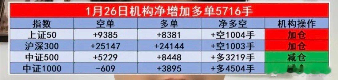 1.26周一晚间 利空来了!中信、机构大幅减仓出逃!最新期指数据来了!中信净增加多单2230手机构净增加多单5716手从期指数据看,今天中信和机构都是大幅减仓的。今天大盘、小盘继续分化,从数据看某队还是在继续大幅减仓,控制好仓位。后续大小盘股可能还会继续分化,呈现指数不跌,个股跌。不作为投资买卖建议,仅供参考