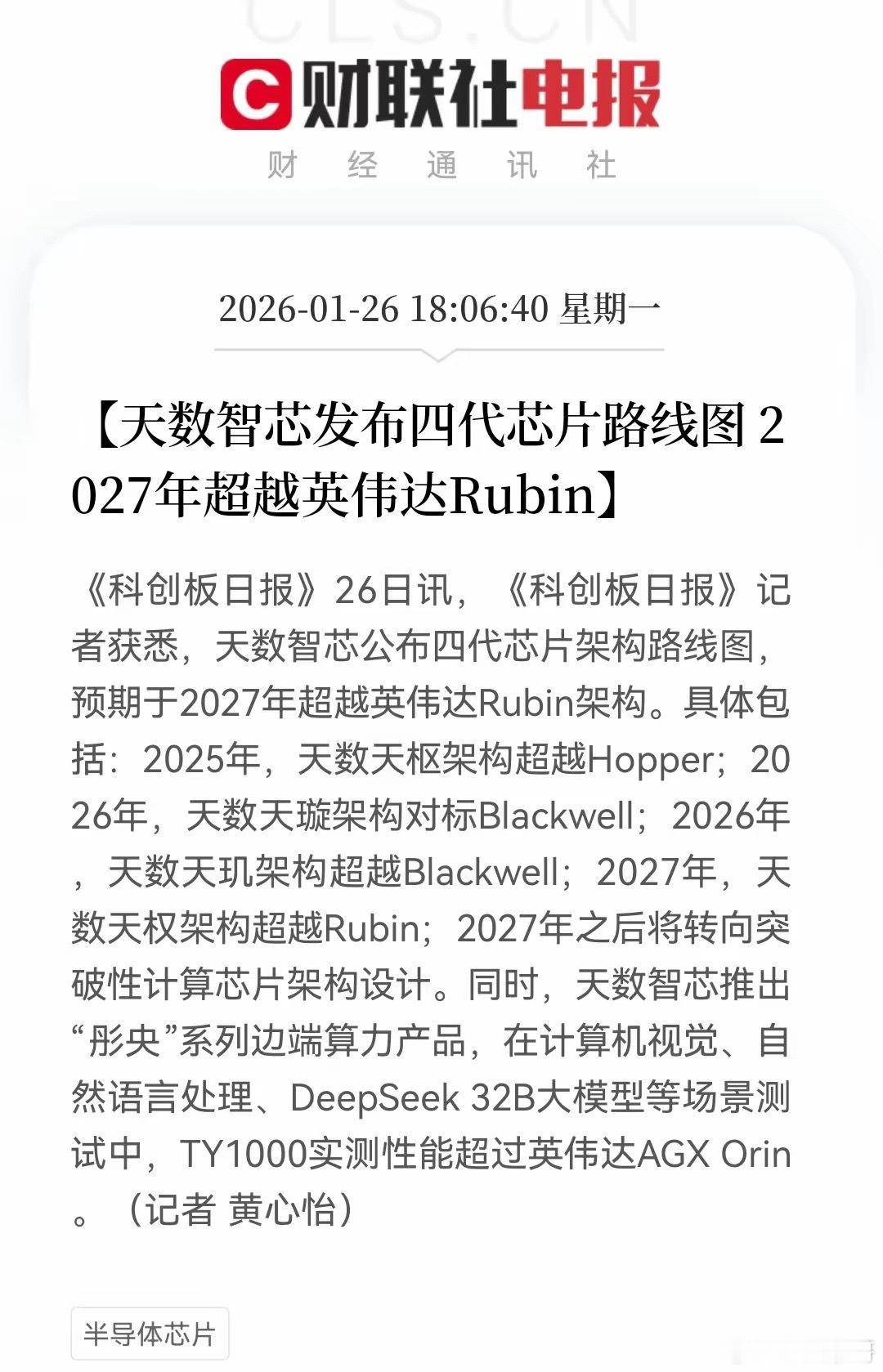 晚间,国产芯片迎来重磅利好,天数智芯要比肩英伟达了。这个消息非常重磅,消息提及“芯片路线图”即将超过世界第一的英伟达,说明了我们的芯片企业的创新能力和设计能力是非常强大的。可能很多人看到是“芯片路线图”只是认为只是图纸罢了,有什么了不起的,其实大家不要小看这一领域的重要性。我在此也说说这个“芯片路线图”吧!芯片路线图就是指导半导体行业对芯片制造工艺、晶体管架构及相关技术未来发展趋势的系统性规划和预测。其旨在为芯片制造商、设备供应商和科研人员提供技术演进的参考方向。也即是其为芯片发展的指路明灯。此消息最令人为之一惊的还有就是天数智芯推出“彤央”系列边端算力产品,在计算机视觉、自然语言处理、DeepSeek 32B大模型等场景测试中,TY1000实测性能同样也超过英伟达AGX Orin。此消息大利好就是以芯片为首的国产代替方向,看看明天板块的表现吧,大概率不会差的,这个消息是跨越式的。