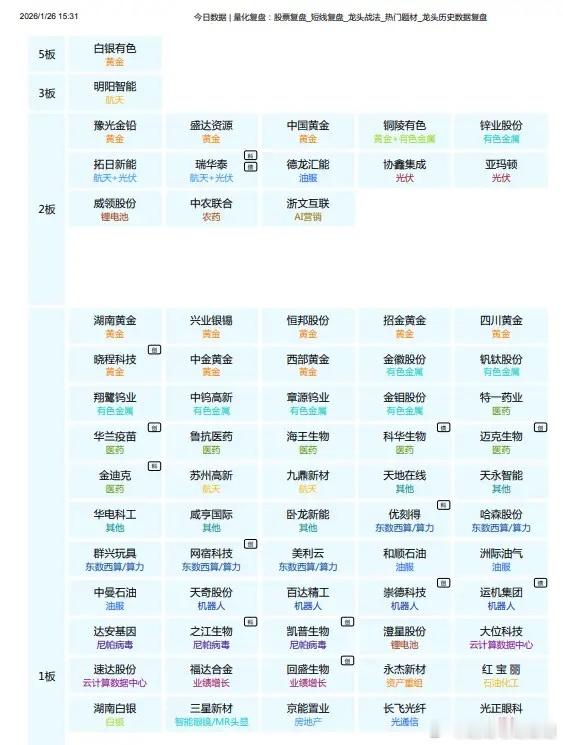 明日热点题材核心分享1.271.黄金有色核心:湖南黄金人气:四川黄金、中金黄金、招金黄金、西部黄金、晓程科技铜陵有色、湖南白银、白银有色现货黄金涨势如虹,盘中站上5100美元/盎司,日内大涨超110美元,涨幅逾2%涨价驱动,大宗商品不停涨利好相关有矿的企业,白银的主升也猛,加速冲的感觉,不弱不走吧持仓的话当趋势对待2.尼帕病毒核心:达安基因人气:之江生物、回盛生物,迈克生物、凯普生物、华兰疫苗、金迪克、海王生物、特一药业印度突发尼帕病毒疫情,已造成多名医护人员感染,泰国、尼泊尔紧急升级防控当突发消息题材对待3.商业航天+航天光伏核心:巨力索具人气:九鼎新材,乾照光电,国晟科技,航发,顺灏股份,迈为股份,连城控股现在的航天更多是走新的细分,太空光伏最强,今天老航天出异动是杀跌的,跟光伏这条线当轮动反抽对待4.云计算核心:网宿科技人气:优刻得、大位科技、速达股份、和顺石油、长飞光纤、大位科技、美利云亚马逊云科技近日上调其EC2机器学习容量块价格约15%,其中p5e.48xlarge实例每小时费用由34.61美元涨至39.80美元刺激云计算走强当趋势对待高度5板,黄金方向小幅度放量的一天专注研究短线核心,把控市场的情绪实现复利个人看盘记录,不构成投资建议