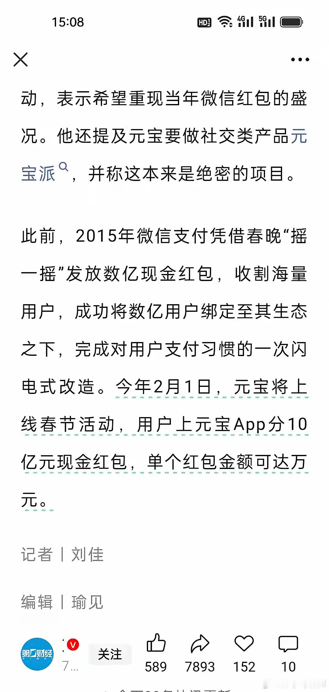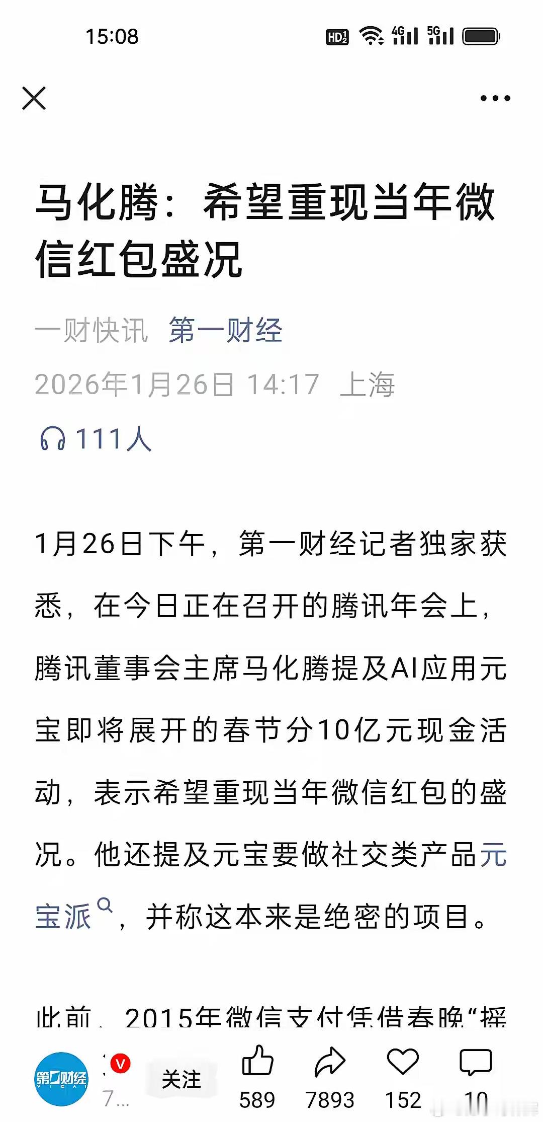 马化腾今天年会上说豪掷重金押注AI,究竟在赌什么?去年马化腾砸重金布局AI,核心原因藏着三层行业考量:1. 锚定AI时代核心赛道,弥补腾讯在通用大模型领域的前期短板,抢占技术话语权;2. 依托微信生态优势,以元宝AI打通社交+AI场景,打造差异化竞争壁垒;3. 应对豆包、deepseek,通义千问等头部玩家的市场挤压,避免在行业洗牌中掉队。这一布局对豆包、deepseek,通义千问形成直接冲击:腾讯凭借海量用户基础和生态联动,快速分流市场流量,倒逼三大头部加速技术迭代、升级场景落地能力,AI行业的头部竞争也因此进入更激烈的贴身博弈阶段。另外,腾讯元宝在昨天就官宣了春节要发10亿现金红包,单个红包最高1万元。腾讯今年提前在AI发力,这场提前布局的豪赌,终将让AI行业的头部厮杀愈演愈烈,看看其他的AI应用跟不跟。