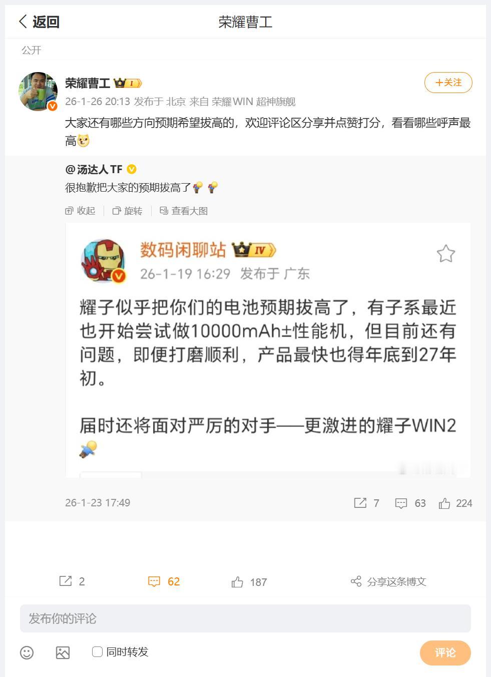 大电池搭载在手机中就能够得到理想的续航吗?其实并不是这样的,还需要工程师进行调教才能够得到理想的续航,刚刚看到荣耀研发工程师曹工表示,大家对于大电池的预期也是可以理解的,荣耀WIN系列的调教确实理想 畅聊数码新品 数码资讯