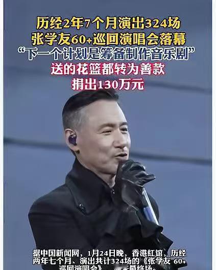 64岁的张学友在《60+巡回演唱会》终场时捐款130万港元,用于基层民众的中医诊疗服务。 在2026年1月24日举行的《60+巡回演唱会》香港红磡体育馆站中,张学友不仅以精彩的演出征服了现场的324名观众,还在演唱会结束时做出了令人感动的决定——将收到的所有亲友花篮折现并加上赞助商善款共计130万港元捐赠给了香港慈善机构“快乐港仁”,专门用于1.3万名基层民众的中医诊疗服务。 这一举动不仅刷新了华人歌手单轮巡演场次纪录,更是体现了他多年来坚持的慈善理念。尽管张学友近年来面临一些关于家庭财务的争议,但他的善举无疑再次证明了他是公众心目中的慈善巨星。张学友 演唱会 慈善 巡演 娱乐
