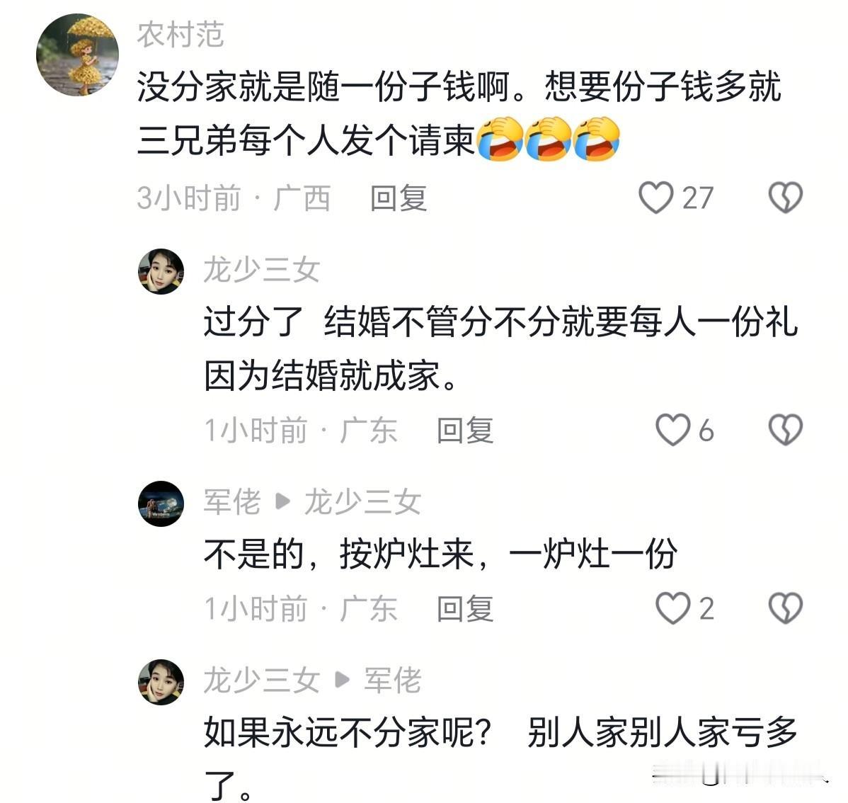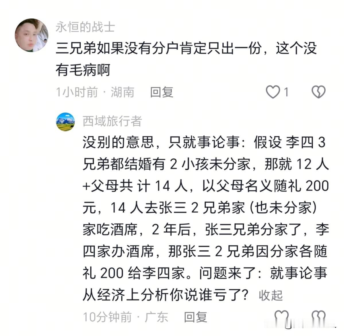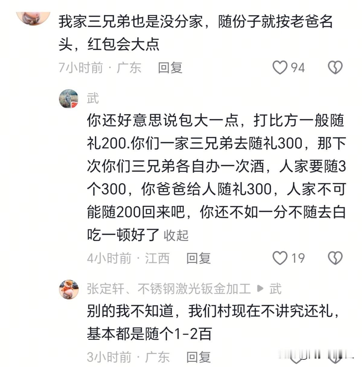 搞心态啊!原来两广办酒席,不在乎参加的人给不给随礼的优良作风人设,都是假的! 有网友好像彻底装不下去了,事实上在两广也是有大把人,他们不想亏本办酒席! 事情是这样的: 有个广西网友发视频称在他们村,有户村民三个儿子已经成家但因为没有分户,所以每次参加村里的酒席,都是以父亲名义只给一份随礼钱。 作为一个南方人,看到这样的吐槽觉得有点奇怪,因为在网上经常看到有南方的网友,特别是两广的,他们一直强调在他们家乡是不需要给随礼的,就算给也是折一角原路返还,并且还能得一份伴手礼。 哪知道点开评论区,却发现事实上并不是这样的! 不少两广的网友为此吵得不可开交,支持的人认为户口没分给一份随礼是正常的! 反对的人却认为这是在占便宜,让亲戚多花了办酒席的成本。