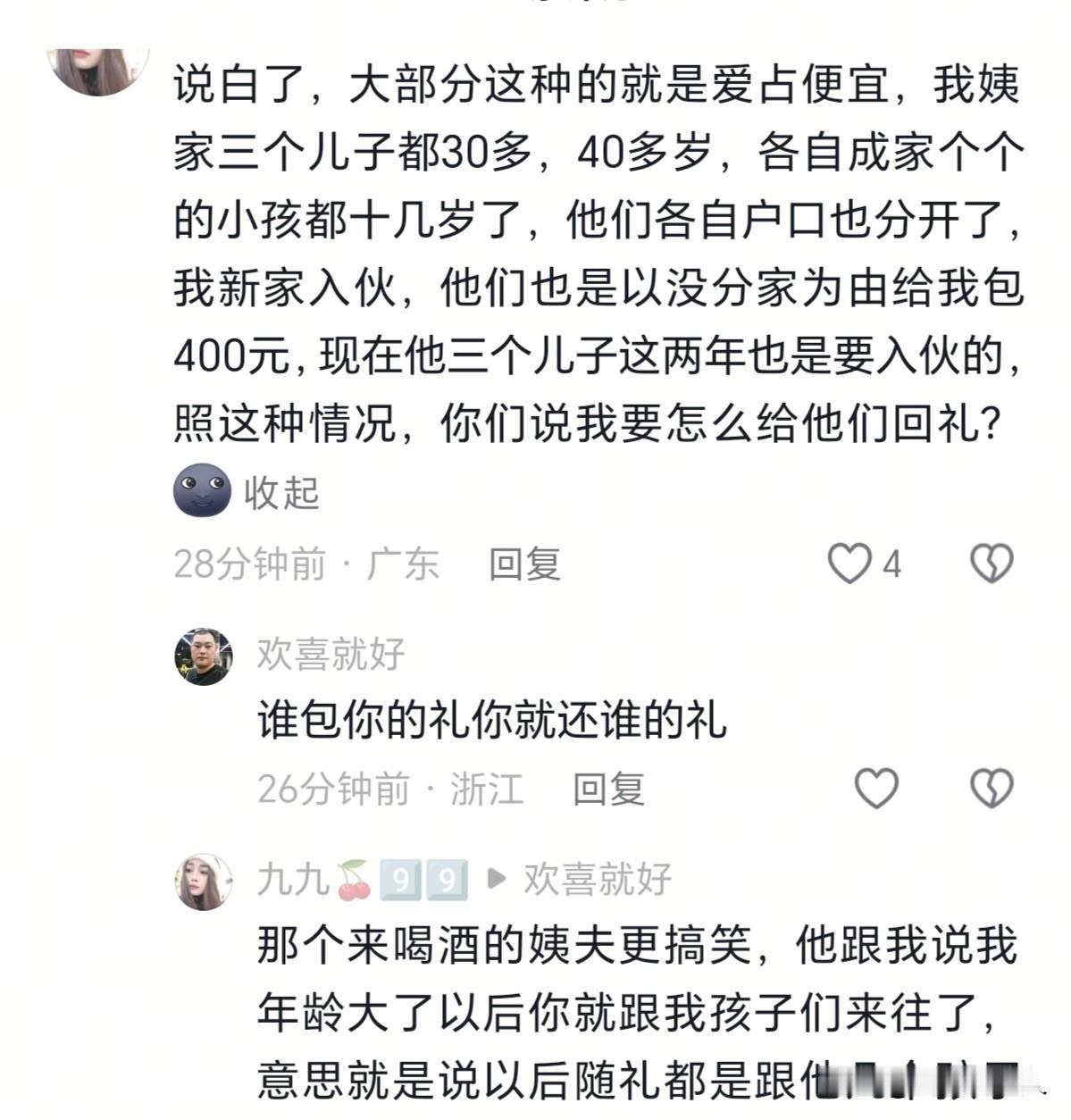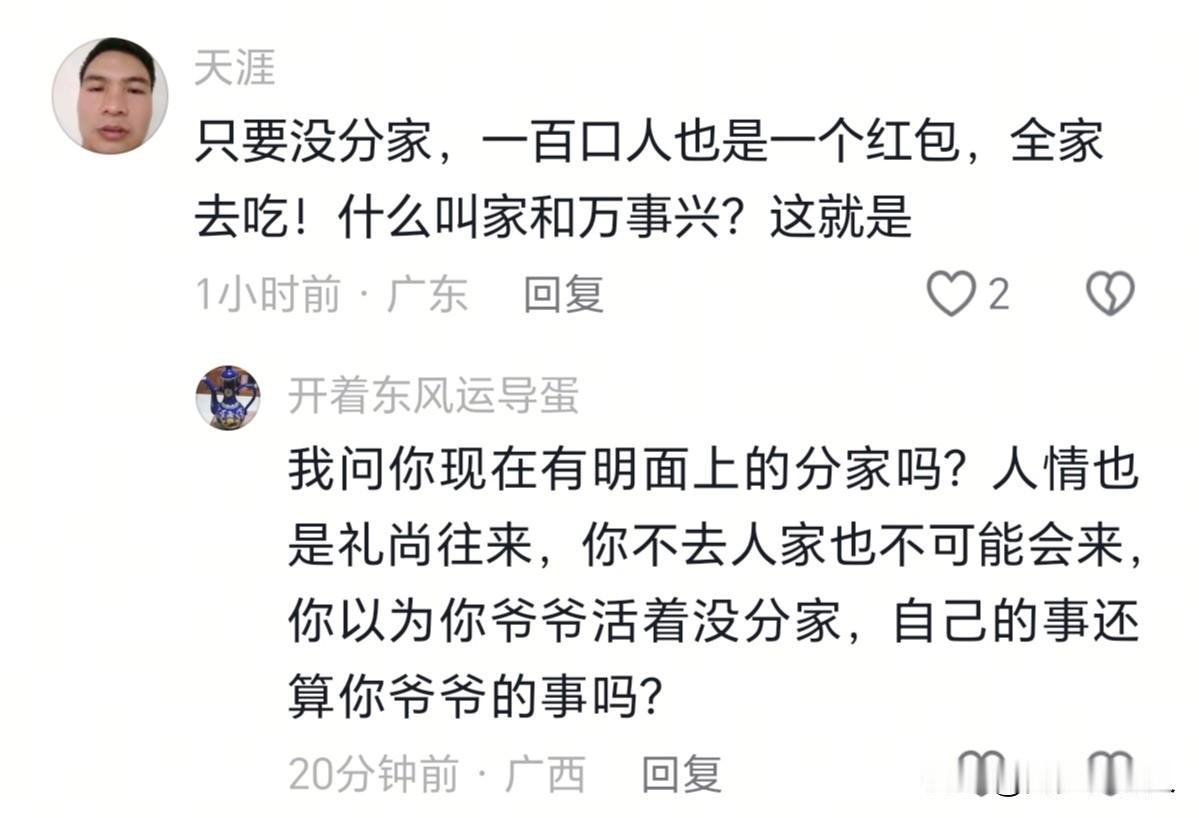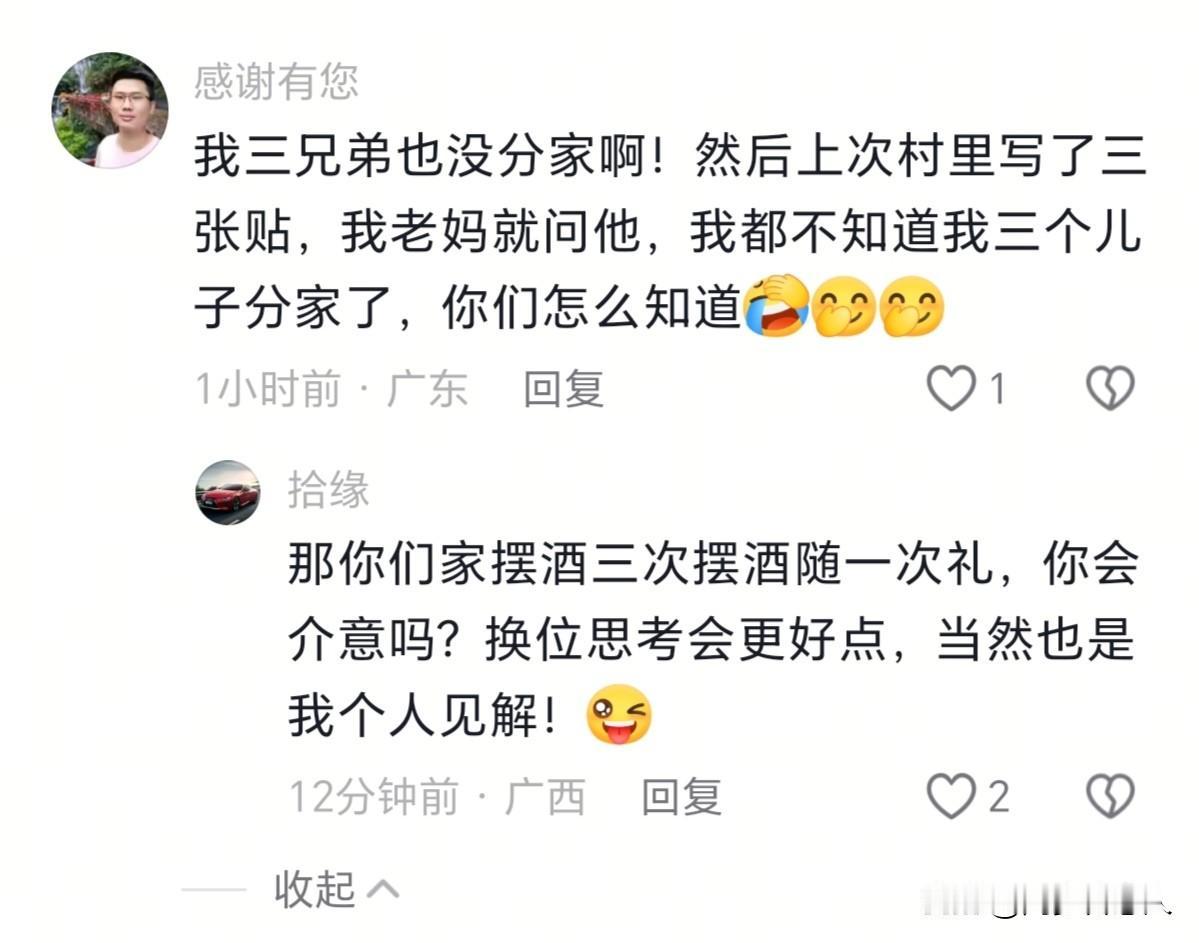 搞心态啊!原来两广办酒席,不在乎参加的人给不给随礼的优良作风人设,都是假的! 有网友好像彻底装不下去了,事实上在两广也是有大把人,他们不想亏本办酒席! 事情是这样的: 有个广西网友发视频称在他们村,有户村民三个儿子已经成家但因为没有分户,所以每次参加村里的酒席,都是以父亲名义只给一份随礼钱。 作为一个南方人,看到这样的吐槽觉得有点奇怪,因为在网上经常看到有南方的网友,特别是两广的,他们一直强调在他们家乡是不需要给随礼的,就算给也是折一角原路返还,并且还能得一份伴手礼。 哪知道点开评论区,却发现事实上并不是这样的! 不少两广的网友为此吵得不可开交,支持的人认为户口没分给一份随礼是正常的! 反对的人却认为这是在占便宜,让亲戚多花了办酒席的成本。