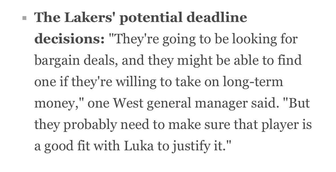 ESPN记者Tim Bontemps谈湖人在交易截止日前的潜在操作方向:一位西部球队总经理表示,“他们会物色捡漏型交易,若愿意接手长期合同,或许能找到合适的目标。但他们大概率需要确保这名球员能与东契奇适配,这样这笔操作才具备合理性。”