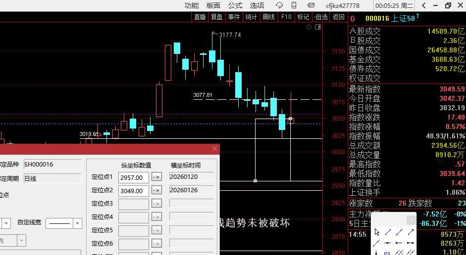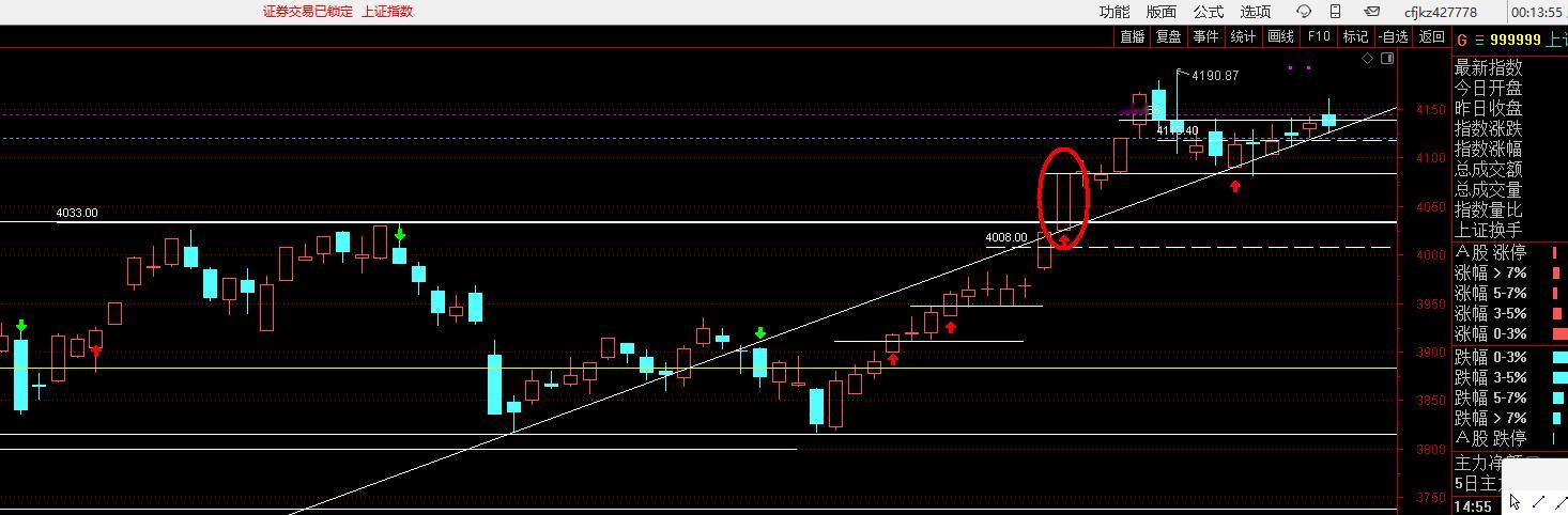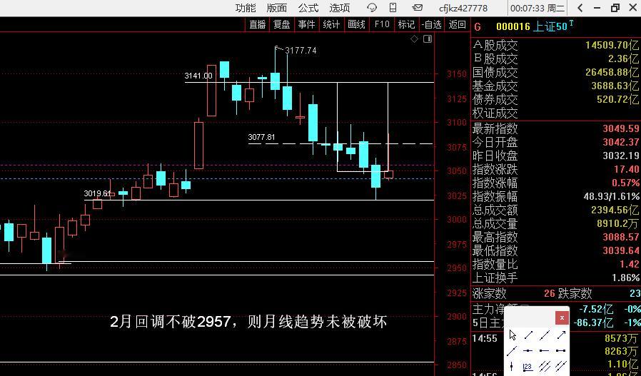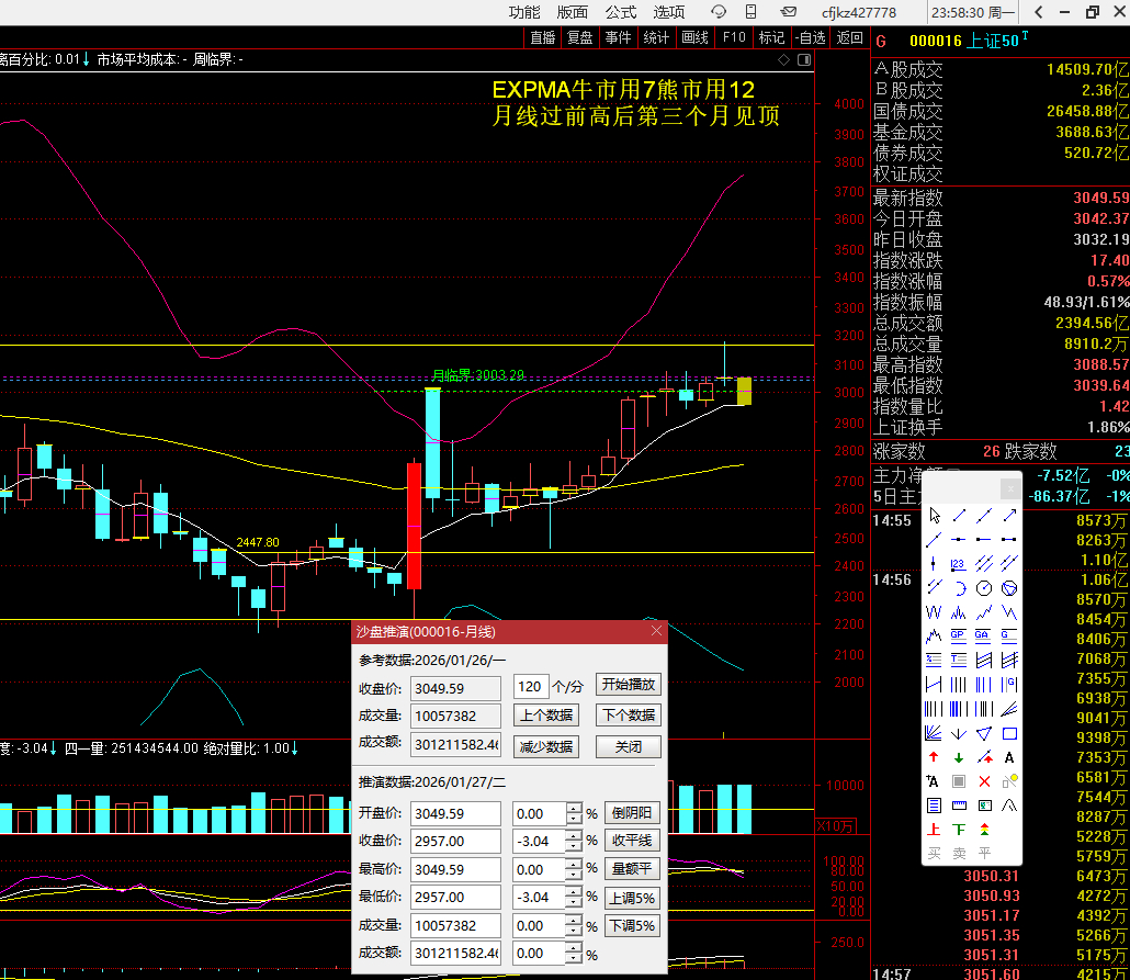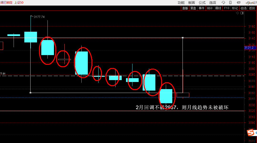 站在上证50月线的角度,牛市还在的一个趋势特点就是月线EXPMA7角度往上,因为现在是1月底,还有几天就到了2月,2月如果打压,极限不跌破2957(或者说在这个价格上完成调整)(图1),其月线的大趋势依然是往上的(图2),回到日象在2957预先画好线,并且在盘面上备注一句话“2月回调不破2957,则月线趋势未被破坏”(图3),同时从节奏去看12月17日正好是最近一个创新高波段的起点第一阳,其实底2955.47是主力必救的位置,如果这个位置不救,牛市就结束了,那么上证50现在的价格点位是3049.59,距离下面的2957还有92点,用92点的距离画一个方框(图4),然后把这个方框往上移动,但是把低点变成3049,再加上92点的类似距离,就到了3141(图5),看上面这个框管住了几天的下跌,我看到的是8天左右(图6),也就是说,如果明天指数往下走坏,极端情况,可能再调8天左右到位,即下周四,立春前后。此外,上证50今天收盘3049,如果真的要去2957,就是要出现约3%的跌幅(图7),因为上证50和上证指数跌幅类似差不多,那么上证指数周一点位是4132,跌去3%就是4000点(图8),这是极端情况,毕竟现在的贪恐指数在高位,上面压力位很多,证券又不够强势,这种情况,必须要做极端预案。上证指数4000点的位置,正好对应(图9)标记的这个价柱,时间是1月6日,过左峰并且经过三日确认为梯量柱的过顶王牌(图10),其实底4026为强势支撑,这样后面如果害人,我就提前把极端预案做好了。至于会不会这样走,不管他,但是如果他这样走了,我就知道极端的、最坏的情况,到了位置上,市场都是合理的,也就不会因为下跌,和其他人一样的去惯性思维,结构性牛市里面,最怕的就是被超级资金在一个风箱里面来回两头赶,你有多少钱都不够亏的。