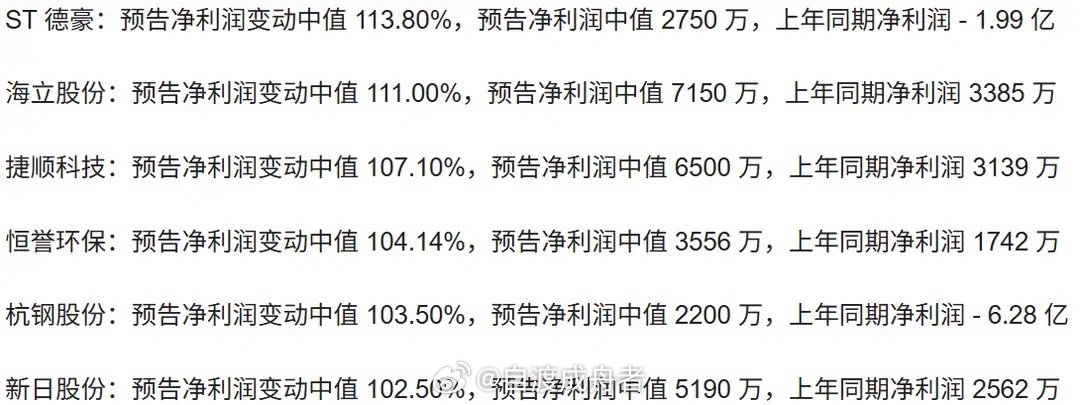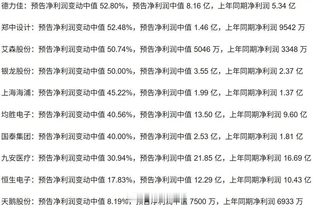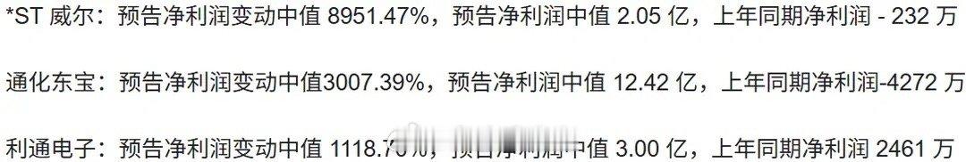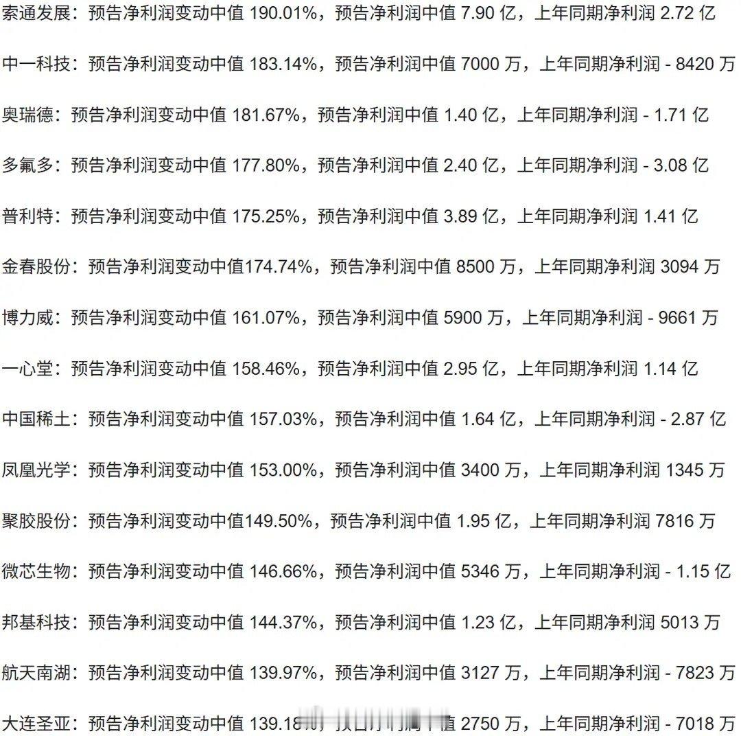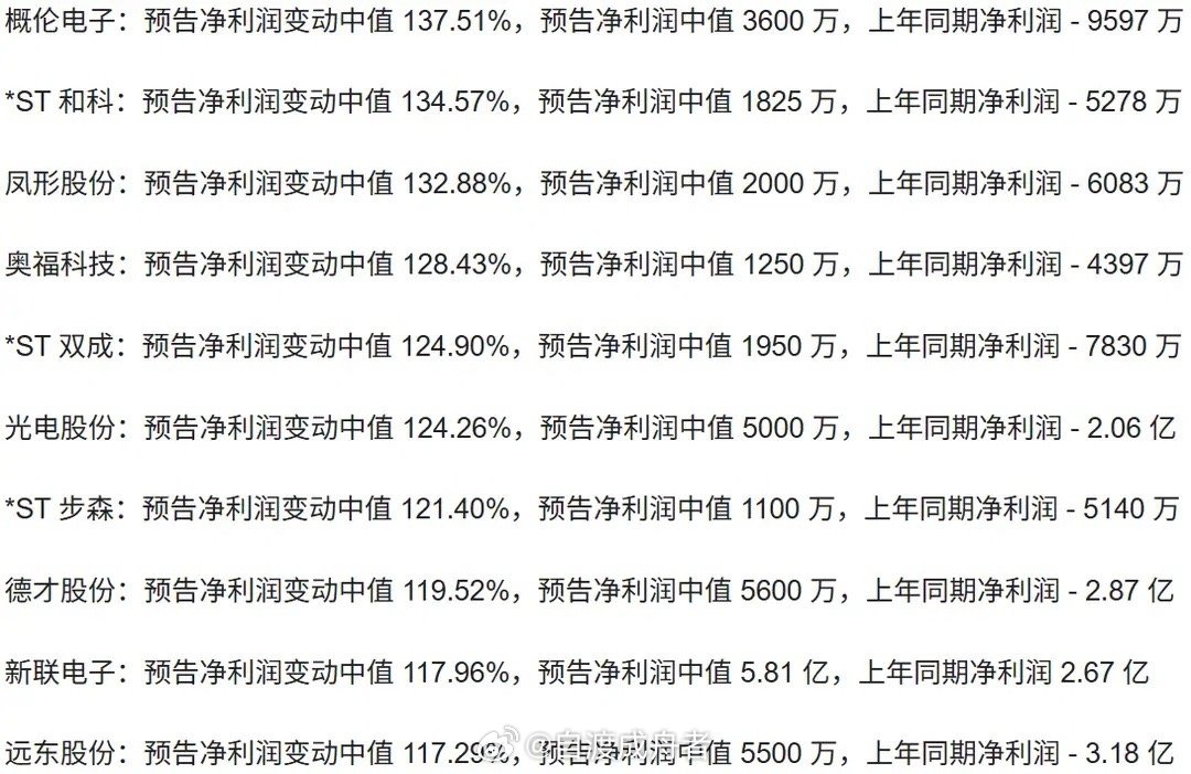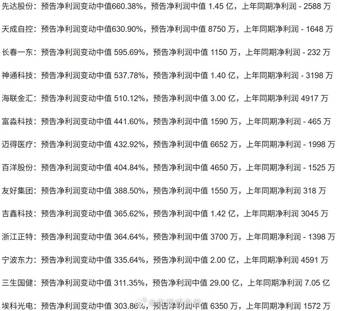深夜传来利好!74家A股发布年报预增公告,其中50家净利润增幅翻倍,最高达8951%!周一A股题材板块集体承压,商业航天、存储芯片、人形机器人、军工等前期热门板块纷纷走弱。不过这也属正常,再强势的板块也难持续单边上涨。而当日收盘后,市场迎来年内单日最多的预增公告潮,截至目前已有74家公司披露年报预增信息,其中50家增幅翻倍,最高增幅更是达到8951%。以下数据均来自公司公告,可供参考比对:首先是预增超1000%的3家公司:• *ST威尔(威尔泰)增幅超8000%,主要因去年基数较低,叠加今年完成重整带来较高投资收益;• 胰岛素龙头通化东宝增幅超30倍,不过大部分收益来自股权转让产生的非经常性损益;• 利通电子则受益于算力业务增长及制造业亏损收窄。其次是增幅200%以上的16家公司。值得注意的是,增幅20%以上的公司中,不少来自机器人概念及科技领域:• 算力概念股淳中科技增幅超2倍,主要依赖持有沐曦集成股份的投资收益,其主营业务仍处亏损且规模下滑。接下来是增幅100%-200%的31家公司:• 六氟磷酸锂龙头多氟多,年报净利润预计中值2.4亿,三季度已实现7000万,四季度贡献约1.7亿,在锂电板块中表现中规中矩,主要受长协低价订单拖累;• 可控核聚变及算力线缆概念股远东股份,净利润预计中值5500万,但三季度已达1.68亿,意味着四季度亏损超1亿;• 算力概念股杭钢股份年内扭亏为盈,但四季度仍亏损近8000万。最后是增幅小于100%的24家公司:• 小盘券商华鑫股份增幅中值77%,表现平稳;• 人形机器人+汽车电子龙头均胜电子,净利润预计中值13.5亿,四季度利润超2.2亿,单季利润同比大幅增长。