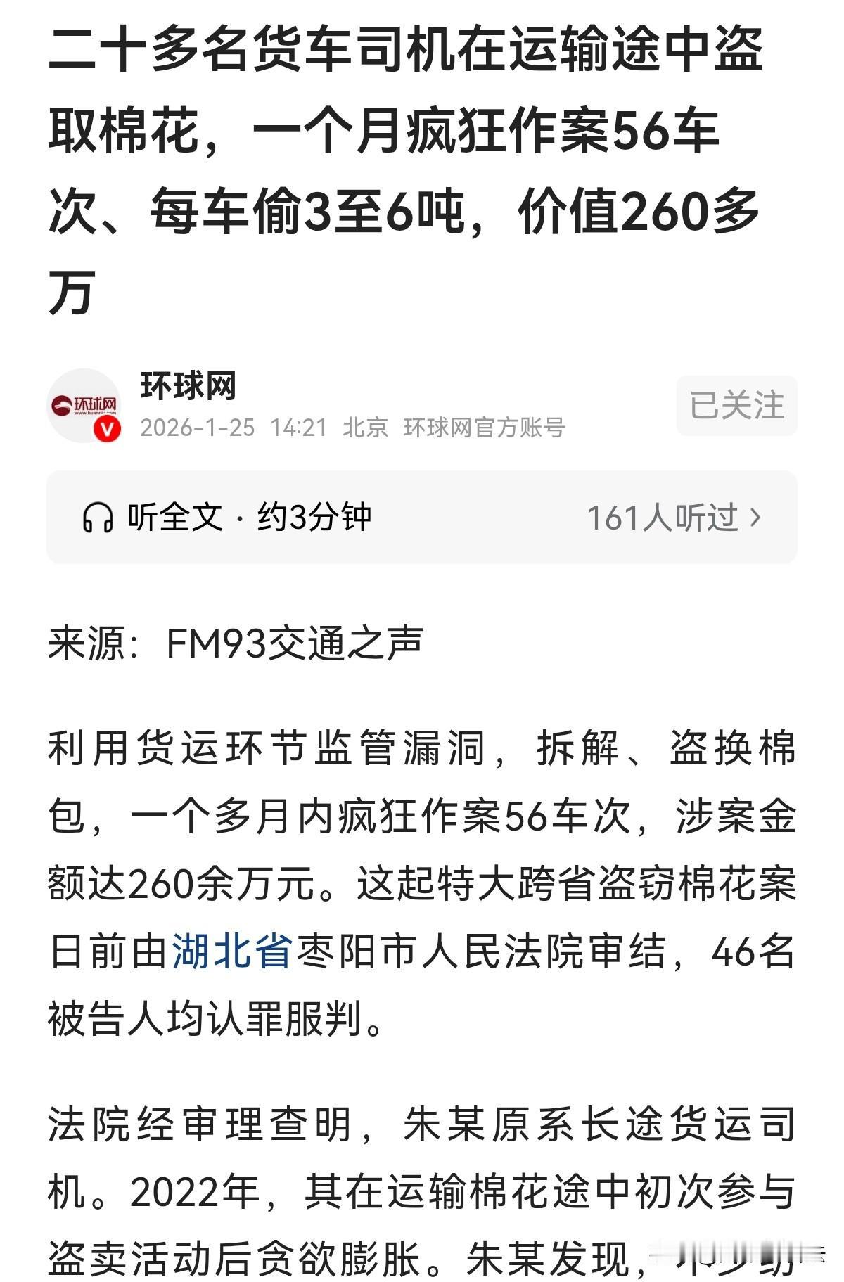 “不义之财是灾祸!”湖北襄阳,一企业订购3车棉花,3名司机通过平台承揽了运输任务。到货后,叉车司机在搬运操作时发现夹取力道不对,感觉轻飘飘比平时的规格轻了不少,他赶紧向仓库管理员反应,管理员一校对发现数量、编号都没问题,认为是叉车司机手感原因。司机只好完成搬运。他越想越不对劲,又将此事反映给企业负责人,结果一检查,每包少了50公斤重量,没车少7吨,3车损失30多万!企业负责人赶紧报警,民警调查时发现,叉车司机欲言又止,在他们的开导下,他说出实情,竟牵出24名货车司机货运途中盗棉花,涉案资金达260万的大案! 李师傅开着叉车握着抱夹的操作杆,指尖刚传来夹取的力道,立马感觉了不对劲儿。 李师傅是老司机,凭他的经验抱夹合拢到正常距离就能稳稳夹住,可这包却像少了点“实在劲儿”,夹到预定位置还松松垮垮,总感觉下一秒就要滑下去。 他下意识调整了两下操作杆,直到确认夹牢才慢慢起吊,脑子里打了个问号:这包怎么轻飘飘的? 当天要卸的棉花足足3车。李师傅干这行多年,摸过的棉包没上千也有几百,轻重心里自有一杆秤。 刚卸了没几包,他心里的疑惑就越来越重:这批棉包是真的偏轻,比平时同规格的轻了不少。 他没敢继续往下卸,赶紧停下手里的活,跑去跟仓库管理员反映情况。 仓库管理员拿着送货单与送货司机逐一对上棉包上的编号。每一个编号都清晰可查,手续看着也都正规齐全,翻来覆去核对了几遍,没发现半点纰漏。 管理员又跟着李师傅去现场,棉包数量够数,外观也整整齐齐,没有破损或被拆动的痕迹。 手续没问题,数量外观也都对得上,会不会是你手感出问题了? 管理员这么一说,李师傅也有些犹豫,难道真是自己多心了?没办法,既然查不出问题,也不能耽误入库,他只能按规矩把3车棉花都卸完归置好。 可当天晚上下班回家,他翻来覆去睡不着,心里像压了块石头,第二天一上班,就忍不住将自己的疑虑跟企业负责人说了。 负责人一听这事,马上组织人抽查称重! 工作人员很快从3车棉花的不同批次里各抽了几件,电子秤上的数字一出来,所有人都吃了一惊,每包竟都少了50公斤左右! 要知道,棉花运输中受湿度影响,重量有个几公斤的误差很正常,但50公斤的差距,明显超出了合理范围。 这里面肯定有问题,棉包八成是被人动了手脚!” 负责人当机立断,直接报了警。 民警赶到仓库后进行了细致检查,很快发现每包棉花的封口处都有二次焊接的痕迹。 这就说得通了,棉花体积大,只要稍微抽走一部分,再重新焊好封口,从外表根本看不出来。 经过全面清点,3车棉花每车都少了7吨左右,按当时的市场价格算,企业直接损失超过30万元。 这起盗窃案的线索很快指向了负责运输的3名货车司机。 原来,这批棉花是企业通过某货运平台订购的,3名司机通过平台承揽了运输任务。可问题到底出在哪个环节?是出厂时就缺斤短两,还是运输途中被人动了手脚?就 在民警准备找李师傅进一步了解情况时,却发现他神色有些躲闪,问起关键问题时总是欲言又止。 其实卸完货当天,那3名货车司机就主动邀请李师傅去吃饭,席间他随口提了一句“这批棉包好像有点偏轻”,没想到其中一名司机瞬间愣了神,下意识说了句:你发现了? 紧接着,司机们从包里掏出几沓现金放在餐桌上,推到他面前说:李师傅,这事你就当没看见,这些钱你拿着,千万别跟别人提起。 看着桌上的现金,李师傅心砰砰直跳,乱成了一团麻。 他当时吓得都懵了:这钱不能拿,拿了就是同流合污。我跟他们说,钱你们赶紧拿走,要不拿走我就坐这儿等天亮。 最后司机们没办法,才把钱收了回去。”之后他一直心里发怵,既担心说了实话会遭到司机们的打击报复,又觉得隐瞒实情对不起企业,所以民警一开始询问时,他才迟迟不敢开口。 有了李师傅的证词,案件很快有了突破性进展。 民警顺着线索深挖,没想到这竟不是一起孤立的案件。 经查,以这3名司机为首的犯罪团伙,利用货运环节的监管漏洞,在一个多月内疯狂作案56车次,涉案金额高达260余万元。 团伙中不仅有24名货车司机负责在运输途中拆解棉包、盗走棉花,还有11名人员专门负责重新打包、焊接封口,形成了一条完整的盗窃链条。 日前,湖北省这起特大跨省盗窃棉花案进行了审结。 24名涉案货车司机因犯盗窃罪,被判处有期徒刑1年5个月至拘役6个月,均适用缓刑,并各处罚金。 11名负责改包缝合的人员分别因犯盗窃罪及掩饰、隐瞒犯罪所得罪,被判处3年至2年有期徒刑,同样适用缓刑,并各处罚金。 一审宣判后,46名被告人均认罪服法,未提出上诉,目前判决已正式生效。 李师傅明智选择,未引火上身,做人就要踏实,不义之财不可取,不然后果不堪设想! 您对这起案件有什么看法?