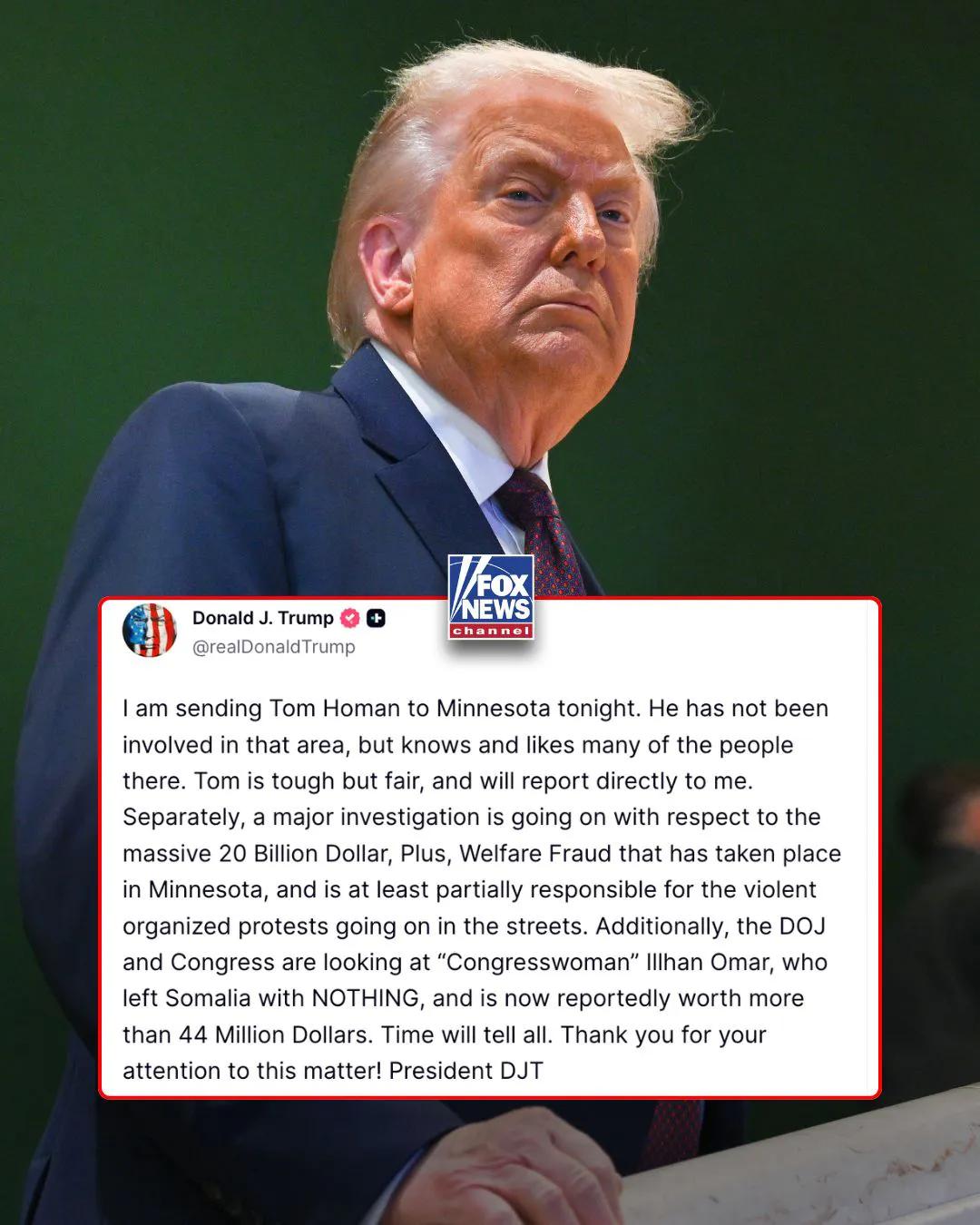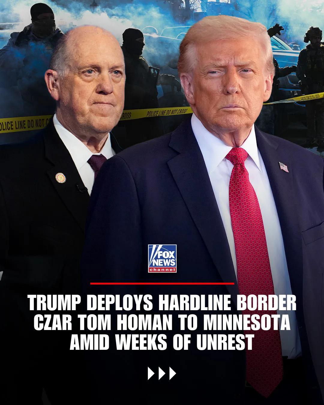 “强硬但公平”:特朗普总统宣布将强硬派边境事务主管汤姆·霍曼派往明尼苏达州,此前该州发生两起致命枪击事件,预计将持续数周动荡。 特朗普总统还表示,已对该州的大规模欺诈丑闻展开“重大调查”,司法部也正在调查众议员伊尔汗·奥马尔的巨额财富。 'TOUGH BUT FAIR': President Trump announces he's sending hardline Border Czar Tom Homan to Minnesota as the state faces weeks of unrest following two fatal shootings. President Trump also said a "major investigation" has been launched into the state's massive fraud scandal and that the DOJ is probing Rep. Ilhan Omar over the congresswoman's skyrocketing net worth.