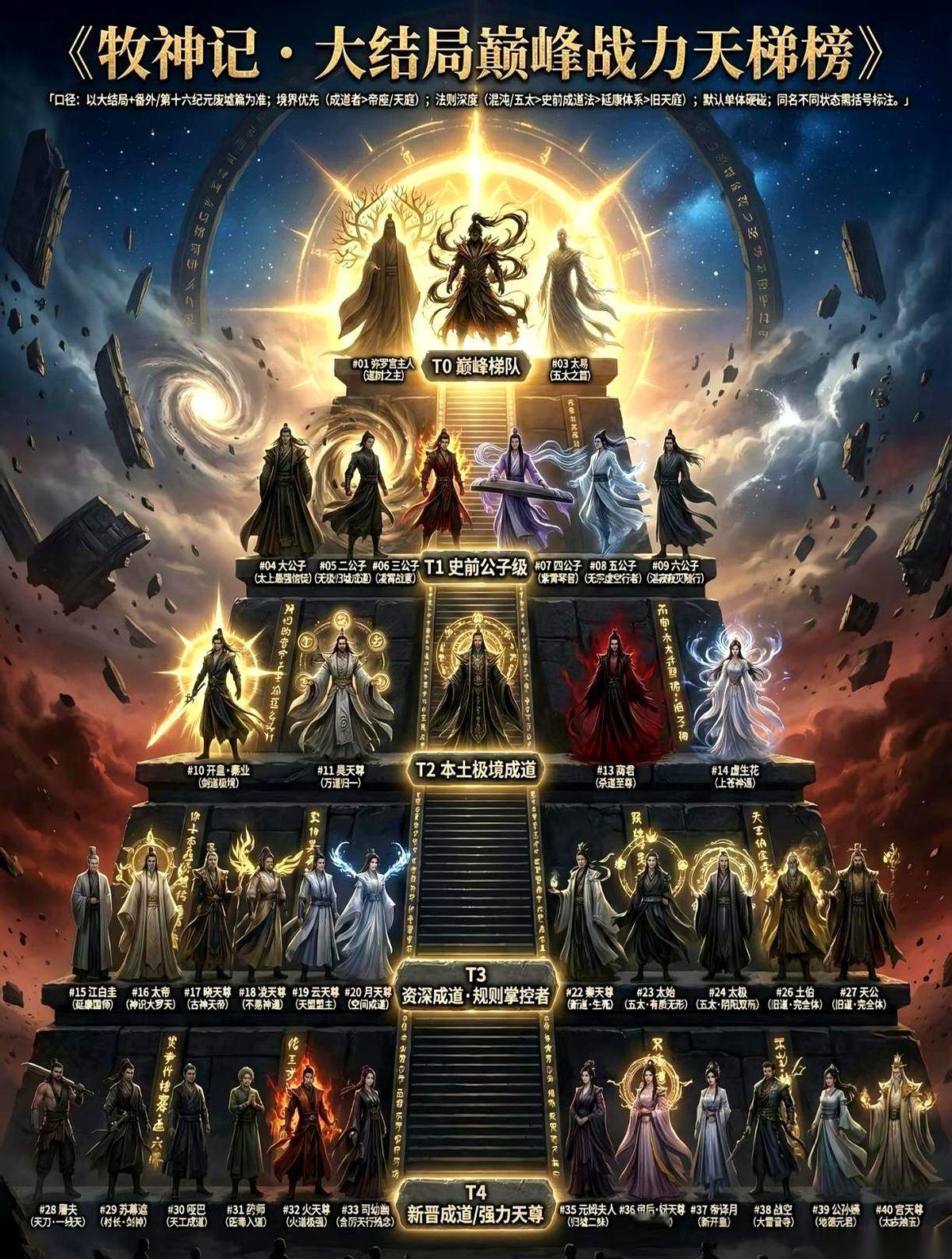 看完《牧神记》大结局,我一晚上没睡着。 脑子里全是那个战力分层。 那哪是战力榜啊,我跟你说,那就是一张“人生尽头说明书”。 一开始,你以为那些开天众、力天尊已经牛逼到顶了,跺跺脚一个宇宙纪元就没了,够狠吧? 结果呢? 往上看,全是爹。 T2的本土成道者,T1的公子级神魔,再到T0那个什么“外纪元破壁者”…… 我看到后面都麻了。 毁天灭地跟咱们下班回家踩死一只蚂蚁似的,眼睛都不眨一下。 他们追求的已经不是赢了,他们追求的是“规则”本身。是那种“我觉得你应该这样,你就必须这样”的霸道。 这打到最后,争的到底是个啥? 我琢磨了半天,争的不是天下第一。 争的是谁能更孤独,谁能把所有喜怒哀乐都彻底从生命里删干净。 咱们天天操心KPI,操心房贷,觉得天都要塌下来了。 人家一操心,就是一个纪元的生灵陪葬。 但那种被命运推着走,卷到最后发现只剩下自己的感觉,可能……是一样的吧。 真就是,神魔的尽头,是虚无。