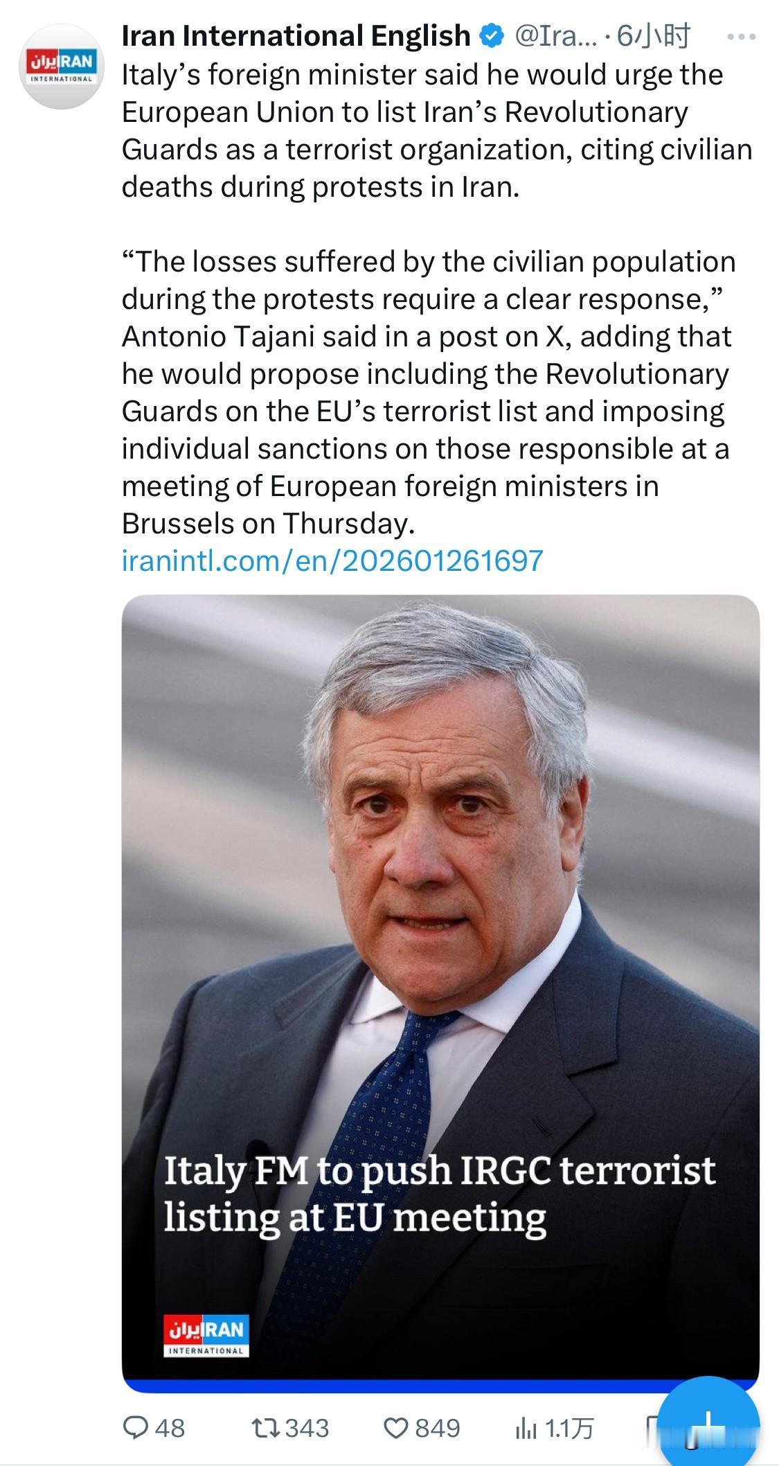 意大利外交部长表示,他将敦促欧盟将伊朗革命卫队列为恐怖组织,理由是伊朗抗议活动中造成平民死亡。 “抗议活动中平民遭受的损失需要明确的回应,”安东尼奥·塔亚尼在X网站上发帖称,并补充说,他将在周四于布鲁塞尔举行的欧洲外长会议上提议将革命卫队列入欧盟恐怖分子名单,并对相关责任人实施个人制裁。