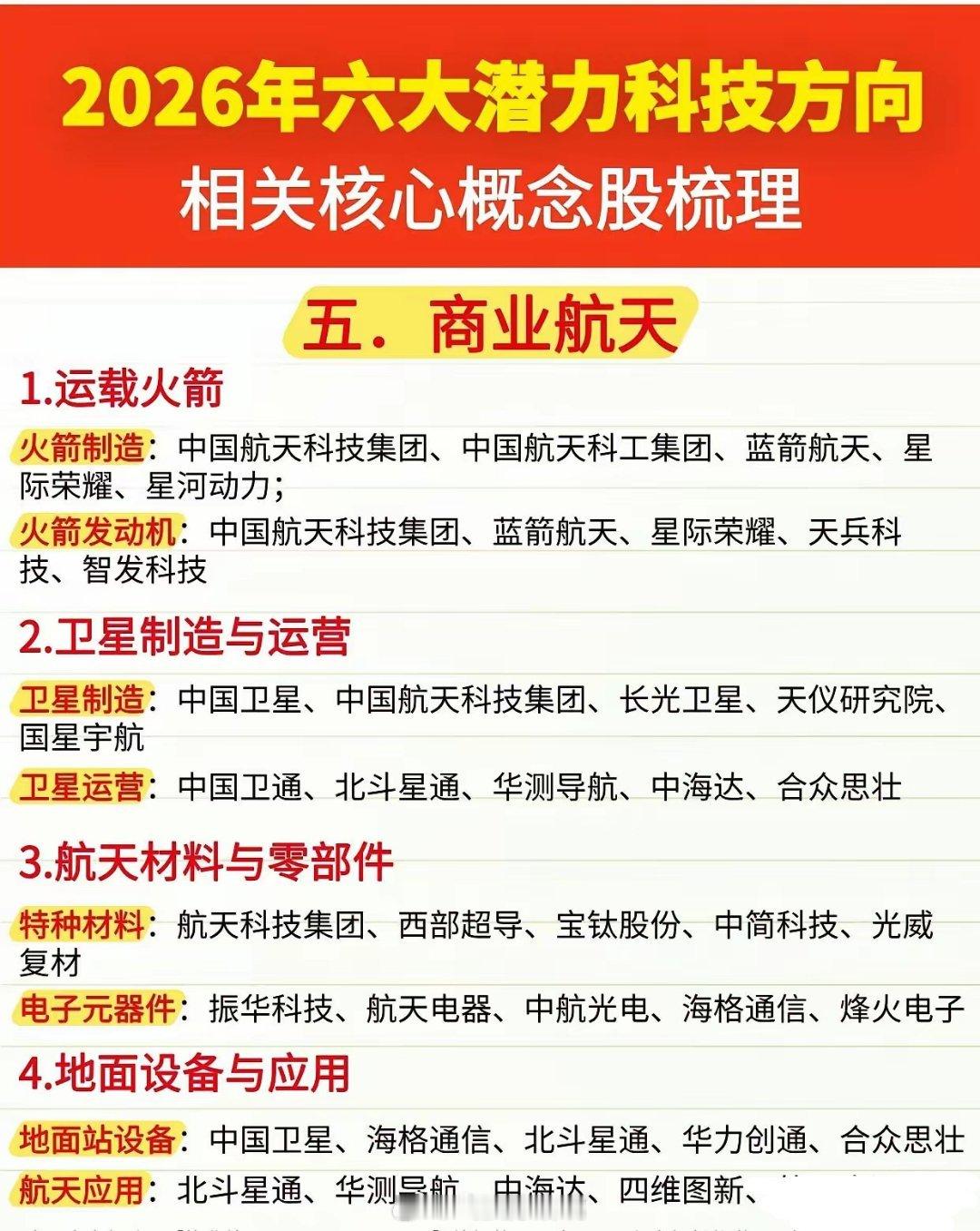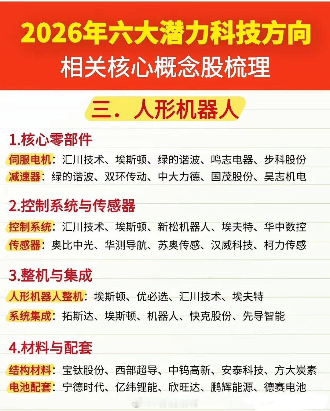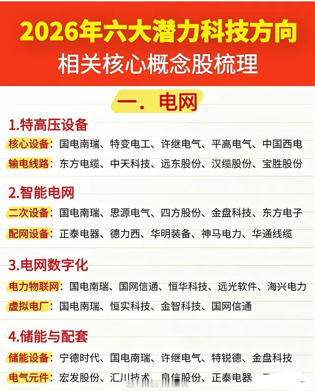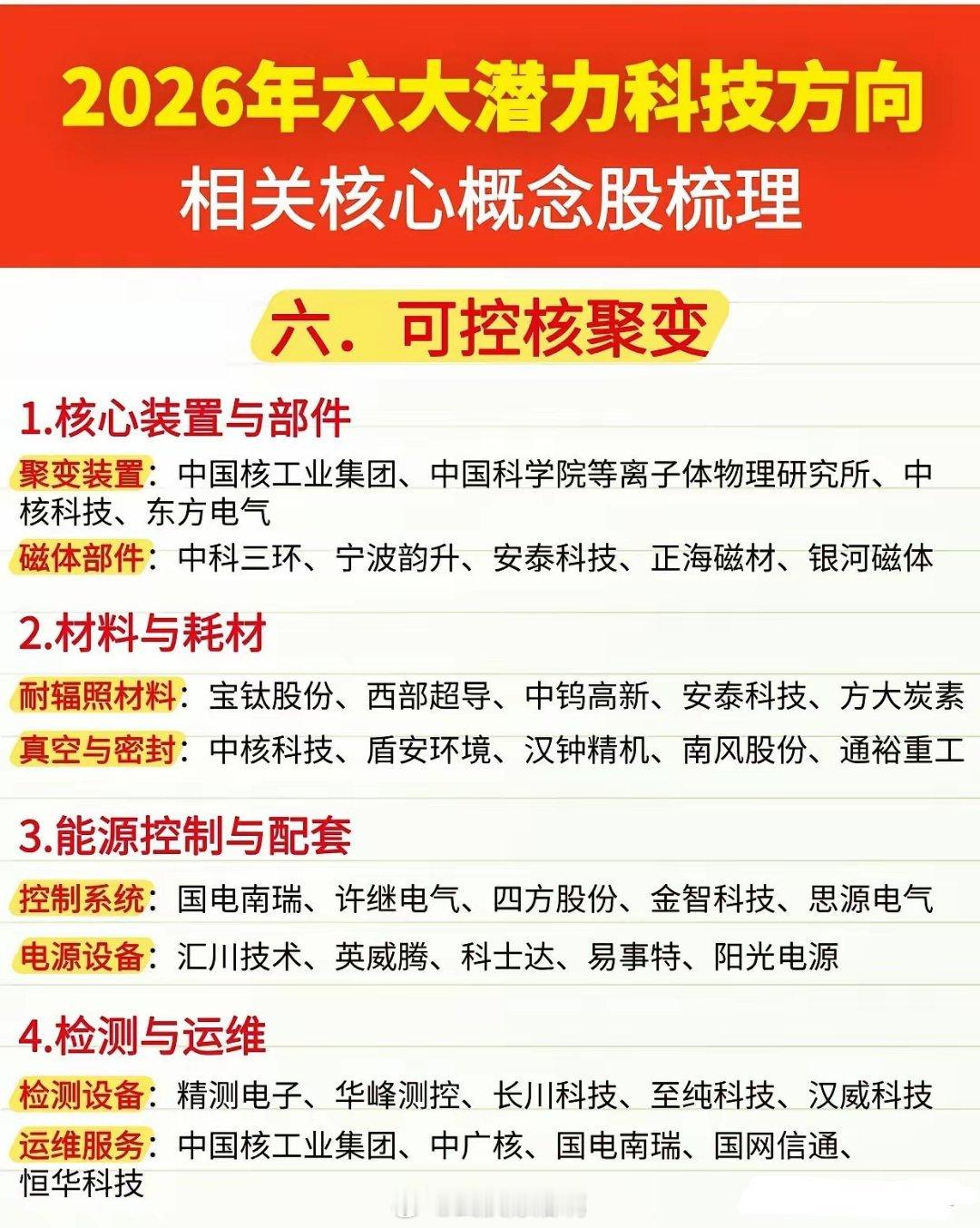 2026年六大潜力科技方向及核心概念股梳理🔥🔌一、电网- 特高压设备:国电南瑞、特变电工、许继电气- 智能电网:思源电气、正泰电器、四方股份- 电网数字化:国网信通、恒华科技、远光软件- 储能与配套:宁德时代、特锐德、宏发股份🧩二、芯片半导体- 核心芯片设计:华为海思、紫光展锐、寒武纪- 晶圆制造与封测:中芯国际、长电科技、通富微电- 半导体材料:沪硅产业、华特气体、容大感光- 半导体设备:中微公司、北方华创、长川科技🤖三、人形机器人- 核心零部件:汇川技术、绿的谐波、鸣志电器- 控制系统与传感器:埃斯顿、奥比中光、华测导航- 整机与集成:优必选、拓斯达、机器人- 材料与配套:宝钛股份、宁德时代、亿纬锂能🚗四、新能源汽车- 整车制造:比亚迪、特斯拉、蔚来、小鹏汽车- 核心三电系统:宁德时代、精进电动、方正电机- 充电桩与配套:特锐德、星星充电、科陆电子- 汽车零部件:旭升集团、德赛西威、中科创达🚀五、商业航天- 运载火箭:中国航天科技集团、蓝箭航天、天兵科技- 卫星制造与运营:中国卫星、北斗星通、华测导航- 航天材料与零部件:西部超导、宝钛股份、航天电器- 地面设备与应用:海格通信、四维图新、航天宏图⚡六、可控核聚变- 核心装置与部件:中核科技、东方电气、中科三环- 材料与耗材:宝钛股份、盾安环境、汉钟精机- 能源控制与配套:国电南瑞、汇川技术、阳光电源- 检测与运维:精测电子、至纯科技、恒华科技这些科技方向是未来产业升级的核心引擎,相关概念股也值得重点跟踪。建议结合行业政策、技术突破和公司基本面综合判断,不构成投资建议哦~