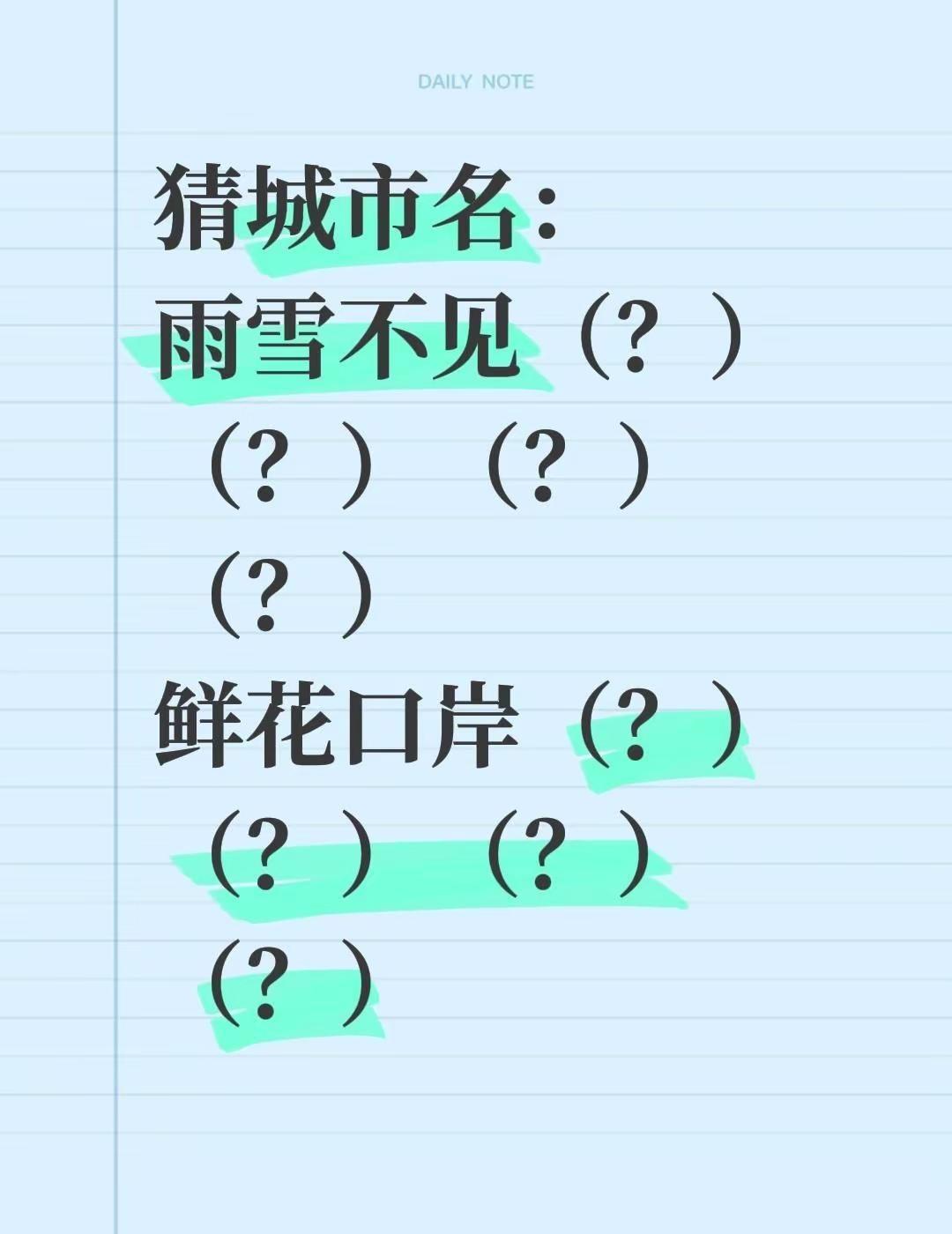 猜城市名:雨雪不见(?)(?)(?)(?)鲜花口岸(?)(?)(?)(?)