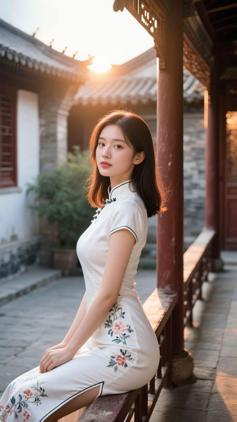 《素旗袍里的夕暖》 古院的夕光漫过檐角,素白旗袍衬出舒展的模样,盘扣轻垂的姿态,浸着松弛的自在。发梢随晚风轻晃,衣摆绣花千缕沾着暖光,连院间的气息都漫开了轻缓的柔。 这不是刻意的妆点,是把“舒展”揉进烟火里:像夕光轻覆衣料的软,像风掠过瓦檐的柔,坐在那里,便成了时光里轻暖的气息。 素旗袍古院穿搭 夕光松弛氛围