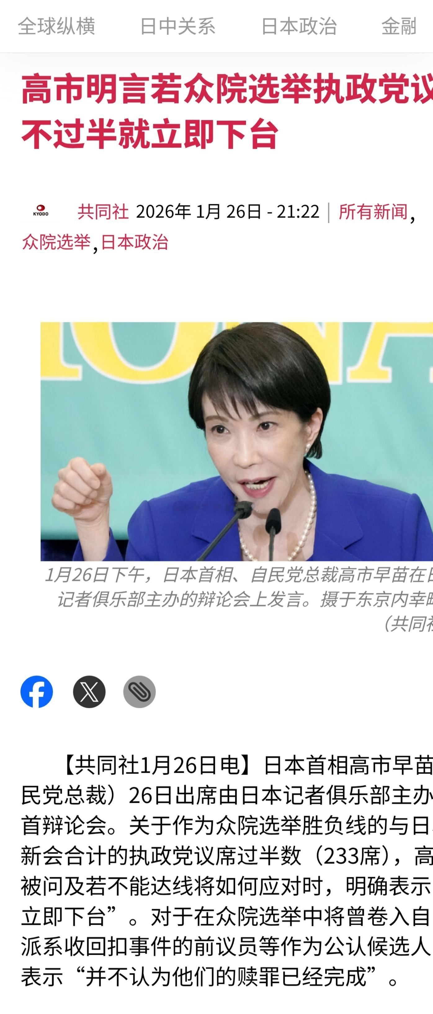 日本首相高市早苗(自民党总裁)26日出席由日本记者俱乐部主办的党首辩论会。关于作为众院选举胜负线的与日本维新会合计的执政党议席过半数(233席),高市在被问及若不能达线将如何应对时,明确表示“将立即下台”。海外新鲜事
