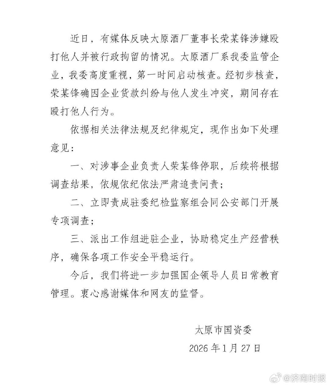 【#官方通报国企董事长上门打人#】#上门打人国企董事长被停职# 27日,太原市国资委发布情况通报:近日,有媒体反映太原酒厂董事长荣某锋涉嫌殴打他人并被行政拘留的情况。太原酒厂系我委监管企业,我委高度重视,第一时间启动核查。经初步核查,荣某锋确因企业货款纠纷与他人发生冲突,期间存在殴打他人行为。依据相关法律法规及纪律规定,现作出如下处理意见:一、对涉事企业负责人荣某锋停职,后续将根据调查结果,依规依纪依法严肃追责问责;二、立即责成驻委纪检监察组会同公安部门开展专项调查;三、派出工作组进驻企业,协助稳定生产经营秩序,确保各项工作安全平稳运行。今后,我们将进一步加强国企领导人员日常教育管理。衷心感谢媒体和网友的监督。