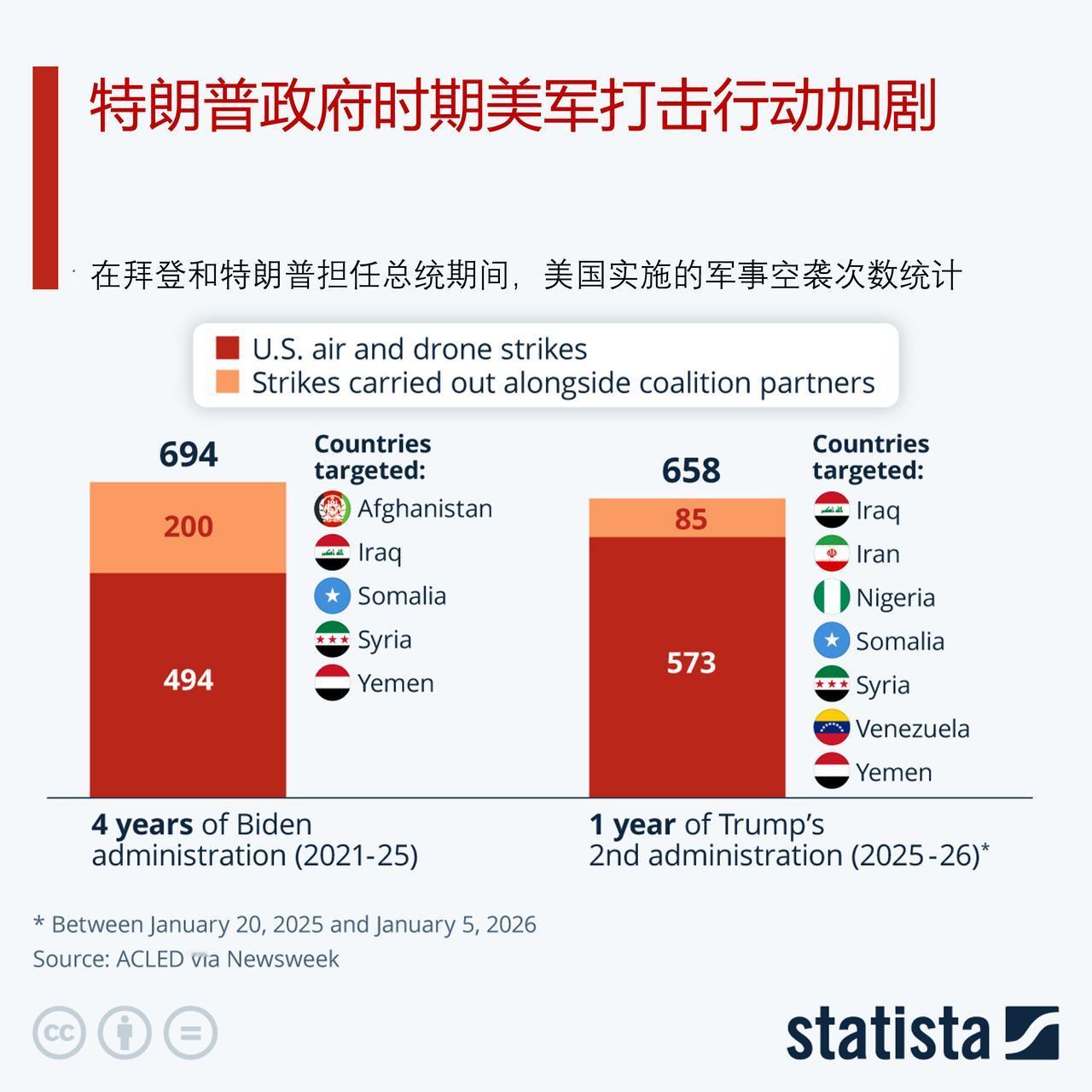 特朗普政府时期美军打击行动加剧 随着美国总统特朗普继续对未获诺贝尔和平奖一事表示不满,并组建了一个自称的“和平委员会”(他暗示该委员会可以取代联合国),而其政府的军事记录却讲述了一个截然不同的故事。根据《新闻周刊》援引的“武装冲突地点与事件数据项目”(ACLED)的数据,在特朗普第二任期的第一年,美国就在国外进行了 573 次空袭和无人机袭击——这一数字超过了乔·拜登整个四年任期内进行的 494 次此类袭击。这些袭击主要集中在也门,但也涉及至少其他六个国家,这标志着美国在海外军事行动的显著升级。 在特朗普执政期间,美国军队曾对也门的胡塞叛军、伊朗的核设施、加勒比地区的贩毒分子以及尼日利亚、索马里、叙利亚、伊拉克和委内瑞拉的不同武装组织发动了攻击。尽管大部分袭击都集中在也门,仅在一年内就造成了超过 500 人的死亡,但这些军事行动的快速节奏和广泛范围还是遭到了分析人士的批评。他们警告称,除此之外,该政府的策略公然挑战了国际规则对军事力量进行约束的观念。 与他的前任乔·拜登相比,两人的政策有着显著的差异。拜登政府的空袭行动仅在四年时间里针对了五个国家,并且主要是在反恐合作框架内进行的。而特朗普执政的第一年,军事力量的使用范围就更加广泛且更为激进。ACLED的首席执行官克利诺达·雷利指出:“在委内瑞拉和尼日利亚等地的近期行动表明,这种策略能够多么迅速地转化为军事行动”,这引发了对全球其他地区进一步升级的担忧。此外,特朗普的军事行动与他在竞选期间的承诺形成了鲜明对比。在竞选期间,他多次承诺要减少美国在海外冲突中的参与,并批评拜登让美国卷入“无休止的战争”之中。