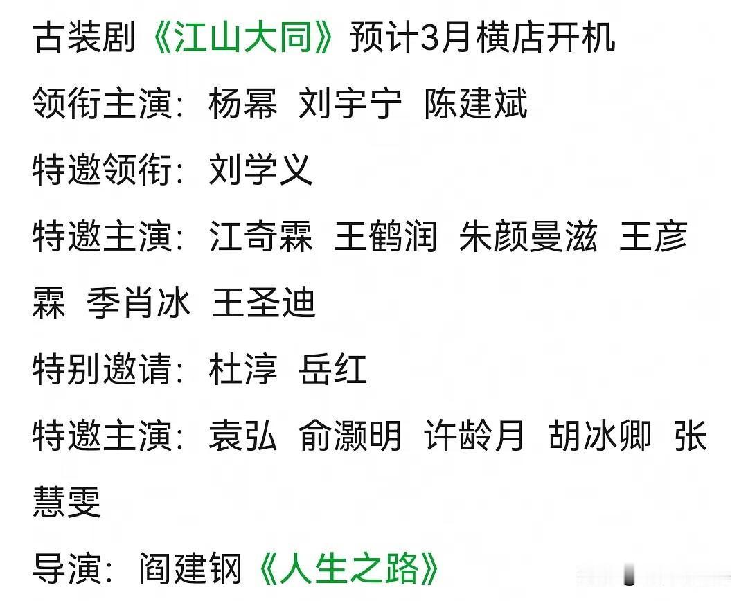 1月27日,刘宇宁否认与杨幂合作出演《江山大同》,直言我没接,那个演员不是我! 刘宇宁提到男二男三人设太好,看过剧本但没接,男主角色不讨喜,容易被男二男三掀桌,男一嘴损但有担当,男二霸总人设,男三爱而不得,说的大概就是这部剧吧! 从刘学义从男一变男三毫无怨言,到陈建斌做男二,都挺符合刘宇宁描述的! 很喜欢刘宇宁谨慎宁缺毋滥的性格,要么不拍,要拍就要选择自己喜欢的剧本跟角色去拍,刘宇宁不同于专职演员,他的歌手事业在某种程度上说比演艺事业更加辉煌,他不拍戏,也有收入,所以他不着急 刘宇宁现在三个身份,歌手,演员,综艺咖,做的都不错,所以他活得很肆意!