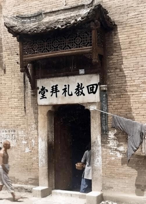 1934-1935年,江西九江“回教礼拜堂”(也作“田教礼拜堂”),这座礼拜堂的入口融合了中国传统建筑的门楼样式与伊斯兰宗教标识。中式的飞檐、砖雕门楼,搭配“回教礼拜堂”的匾额,体现了近代中国穆斯林建筑“中西交融、本土化适应”的特点。 门口晾晒的衣物与行人往来的场景,说明这座礼拜堂并非孤立的宗教建筑,而是深深嵌入当地居民的日常生活,是当时九江穆斯林社群进行宗教活动与社会交往的核心场所。