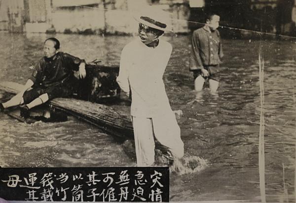 1931年,武汉大水灾期间,一位市民用竹子扎成简易竹筏载运母亲,照片里的母亲坐在简陋的竹筏上,儿子在水中推行。诠释了“灾情急迫,无舟可雇。其子以简当竹筏载运其母”的内容。 1931年长江洪水导致武汉城区被大面积淹没,交通彻底瘫痪。由于官方救援船只严重不足,市民只能依靠木盆、门板、竹筏等自制工具出行,照片中 “以简当竹筏” 的场景正是当时最普遍的自救方式之一。这种简易竹筏不仅用于逃生,也是灾民运输粮食、物资的重要工具。