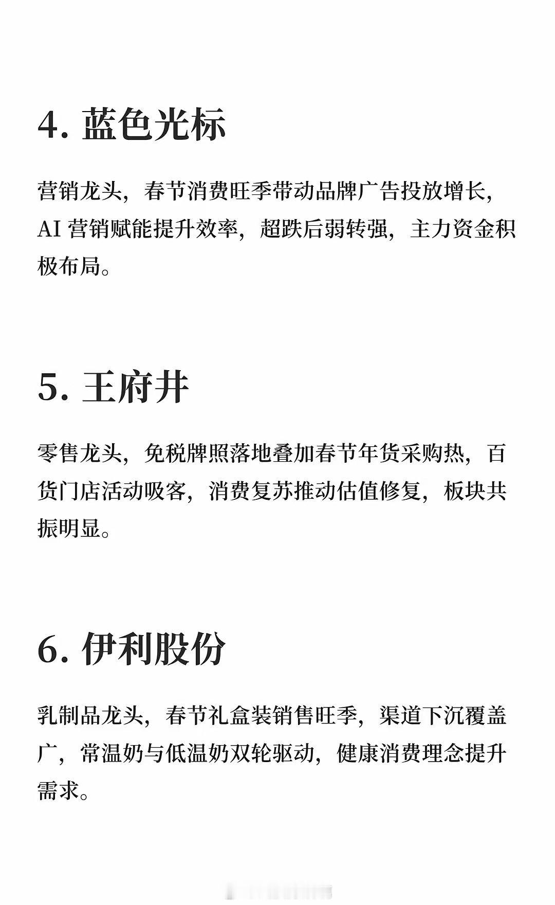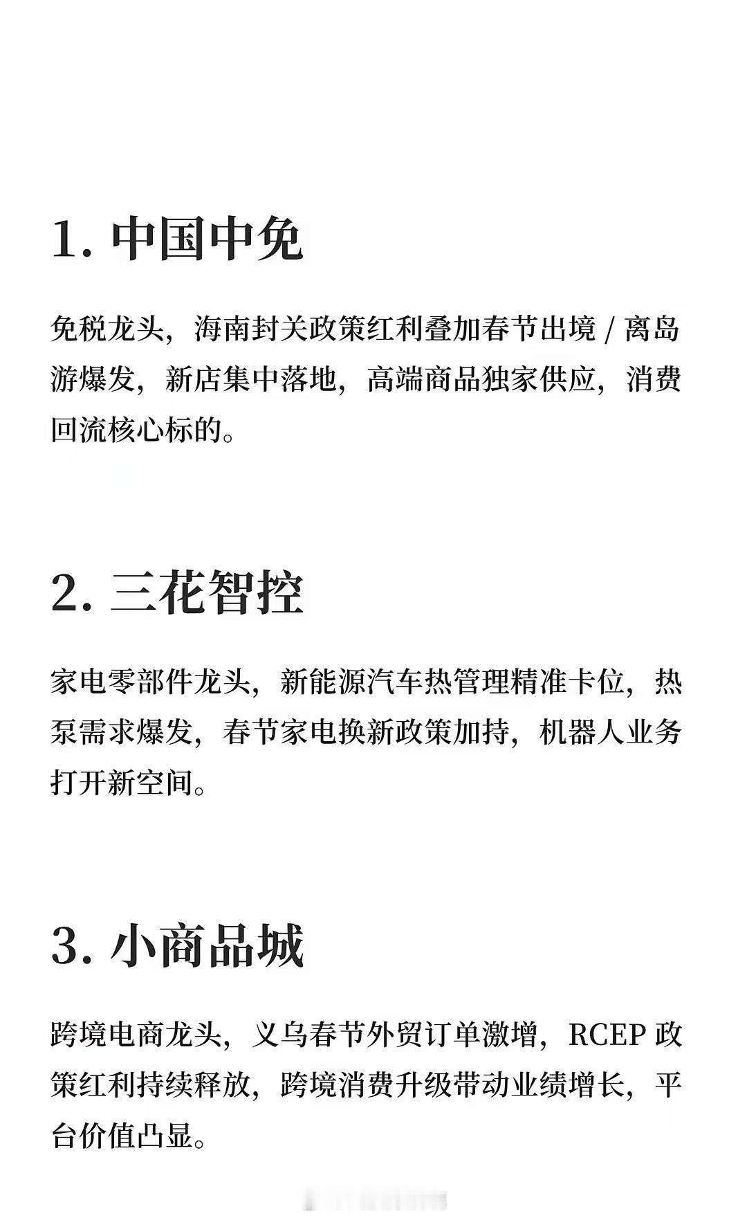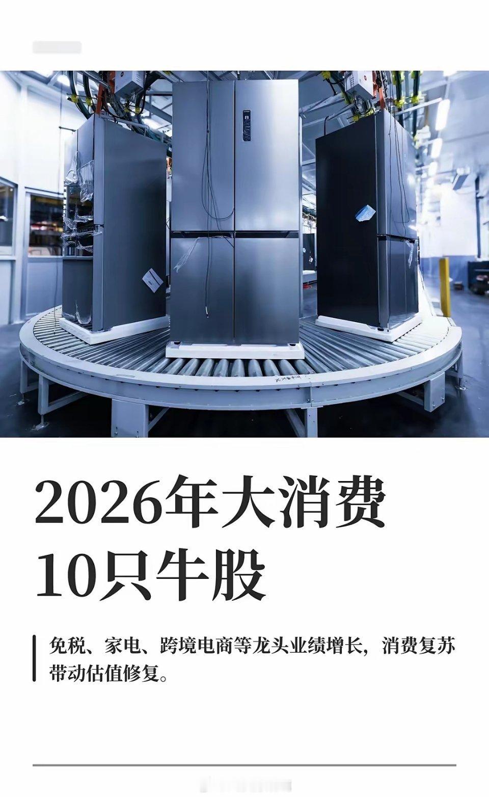2026年大消费10只牛股中国中免、三花智控、小商品城、蓝色光标、王府井、伊利股份、美的集团、牧原股份、格力电器、海天味业等龙头公司受益于春节消费旺季,免税、家电、跨境电商、营销、零售、乳制品、家电、生猪养殖、调味品等板块表现亮眼,消费复苏推动业绩增长。