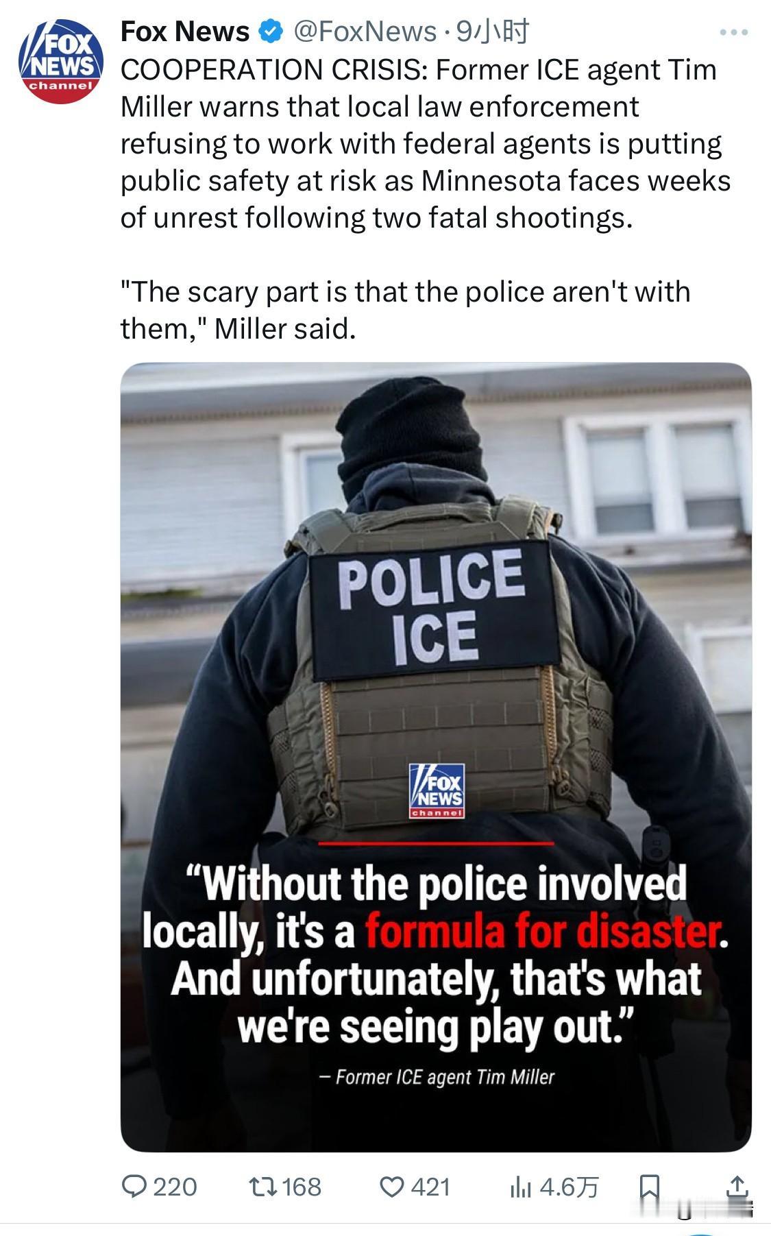 前美国国土安全部(DHS)下属机构 调查局(HSI) 特工提摩西·“蒂姆”·巴拉德(Timothy "Tim" Ballard)警告说,在明尼苏达州发生两起致命枪击事件后,当地执法部门拒绝与联邦特工合作,这正在危及公共安全,该州目前正面临数周的动荡。 “可怕的是,警察没有站在他们那边,”米勒说。