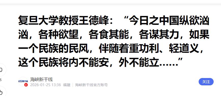 复旦大学教授王德峰,再次抛出惊人“言论”!今日之中国纵欲汹汹,各种欲望,各食其能,各谋其力,如果一个民族的民风,伴随着重功利、轻道义,这个民族将内不能安,外不能立……字字诛心,振聋发聩! 我们很多人心里恐怕都有一个共同的感受:日子确实越过越好了,吃穿用度都上了一个台阶,可心里的那股踏实劲,却好像越来越少,取而代之的是一种说不清道不明的焦躁。 这到底是怎么回事?是我们跑得太快,必然要经历的阶段,还是我们在低头赶路的时候,把一些最根本的东西弄丢了? 每次聊起这些烦心事,大家的第一反应,总是把问题甩给技术、资本和竞争。 说得没错,外卖小哥确实被系统的时间算得死死的,一分钟都不敢耽误。本该救死扶伤的医院,本该教书育人的学校,现在也被创收和业绩的压力追着跑。 年轻人就更不用说了,从找工作到买房子,再到孩子的教育,每一步都像在跟人比赛,身心俱疲。 可仔细想想,这些真的是问题的根源吗?技术本身没有对错,怎么用,是人说了算。 资本就是要赚钱的,但社会可以给它划定规矩和红线。竞争自古就有,真正让人感到窒息的,是成功的标准被收得越来越窄,好像全天下只剩下一条路可走,所有人都得挤上去。 其实,是我们把一些东西的位置摆错了。我们把一个人能赚多少钱、办事效率有多高,看得太重了。 反而把一件事到底该不该做、一个人应不应该担起责任,放到了一个无所谓的位置上。 当功利成了大家心照不宣的第一准则,很多事情就开始变味了。如果医院的首要目标是赚钱,那医生开单子时,考虑的可能就不全是病情,还有科室的收入指标。 如果学校的核心任务只剩下升学率,那教育的目标就窄化成了分数,孩子们的全面发展被放到了次要位置。 有些地方为了追求短期能看到的政绩,一些长远看至关重要的事情,比如城市的排水系统、乡村的基础医疗,就可能被搁置了。 最终的结果是什么呢?就是人与人之间那层最基本的信任,变薄了。 大家做事都得留个心眼,防着别人,整个社会运转起来,摩擦力变得特别大。每个人都觉得活得特别累。 再往大处说,一个国家想在世界上赢得别人发自内心的尊重,光有钱是不够的。 如果我们给外界的印象,只是一个精于计算、会做生意的群体,但缺乏一种让人信服的行事准则和道义担当,那别人很难真正地认同你,所谓的合作基础也就不会牢固。 所以,要走出今天的这个困境,不是要我们停下发展的脚步,回到过去。恰恰相反,是时候把“道义”这两个字,重新摆在一个重要位置上,为飞速发展的技术和资本,确立一个清楚的坐标和底线。 这意味着,政策的制定者在看重经济增长曲线的同时,必须更多地去考量社会公平。 企业在追求利润的时候,必须承担起自己对社会、对环境应尽的责任。 而我们每个人,在每天的工作和生活中做选择时,也需要听一听自己心里的声音,问一问什么事能做,什么事坚决不能碰。 一个社会是不是真的强大,最终要看生活在里面的人,心里安不安稳,人与人之间还有没有那份基本的温暖和信任。 只有当我们都开始把道义和责任,重新放回它本该在的位置上,我们才能从这种集体的精神疲惫中解脱出来,找回那种脚踏实地的安稳和从容。 信息来源:《复旦大学教授王德峰》,海峡新干线,2026年1月25日。