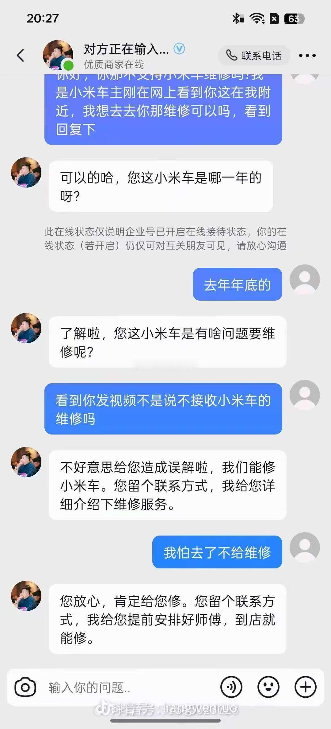 笑死我了看到你发视频不是说不接收小米车的维修吗?不好意思给您造成误解啦,我们能修小米车。您留个联系方式,我给您详细介绍下维修服务。汽场全开 新能源汽车