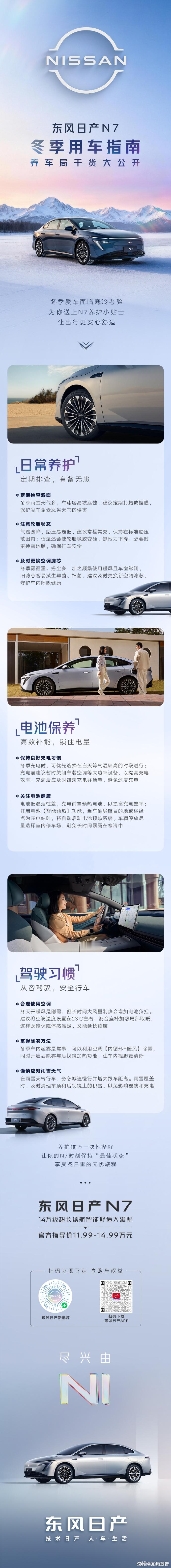 东风日产N7冬季用车指南东风日产N7推出冬季养护技巧,含日常、电池保养及驾驶习惯建议;车辆配备智能云毯座椅等暖心科技,49个传感器保障驾乘体验,低温下续航表现亮眼,为车主冬日出行保驾护航。东风日产N714万级长续航智能舒适大满配东风日产n7最家纯电轿车汽场全开