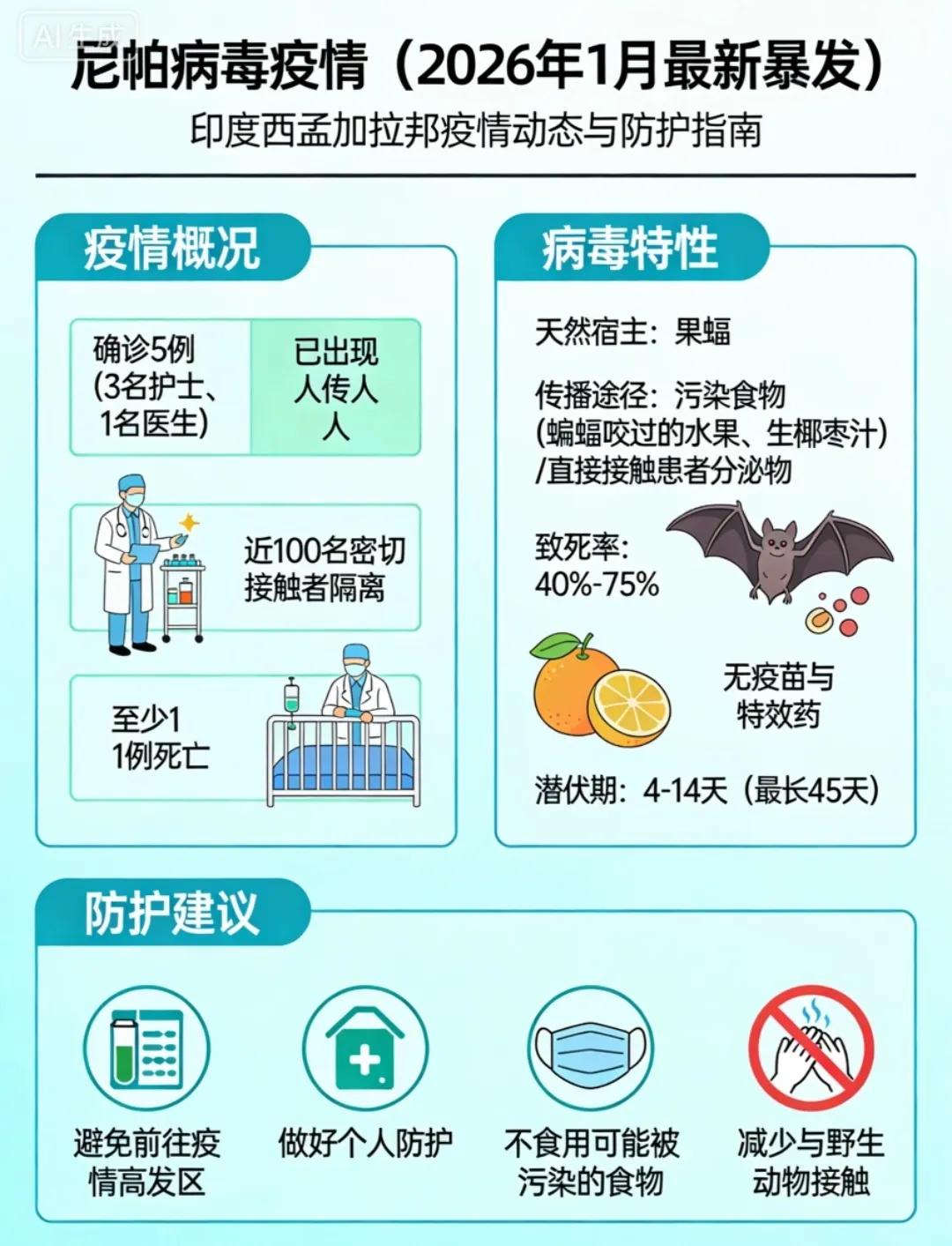 看着印度5例确诊背后的数字 目前已有5例确诊,甚至连医护人员都中招了。我心里猛地一沉。但庆幸自己生在中国! 这种病毒潜伏期长达45天,主要攻击人的肺部和大脑,目前全球竟然没有特效药,也没有疫苗。 说实话,看到这里我原本很慌,但查完咱们国家的应对措施,我瞬间心安了! 第一、咱们国家早在一年前就已经把这个病毒列入了出入境监测目录,这意味着咱们的“雷达”时刻开启着。 第二、国内多家医疗企业已经研发出了国产检测试剂,专家明确表示:我国输入风险总体可控!这种“中国速度”和技术底蕴,就是我们普通人最大的底气。 第三、看着国家在2026年继续推进医疗卫生强基工程,不仅乡村医生在加强培训,连突发公共卫生事件的应对水平也在全面提升。 这种“御敌于国门之外”的实力,真的让人安全感爆棚!这就是我们要挺起的民族脊梁,为伟大的祖国点赞! 大家怎么看呢? 中国对印度疫情的管控如何! 印度