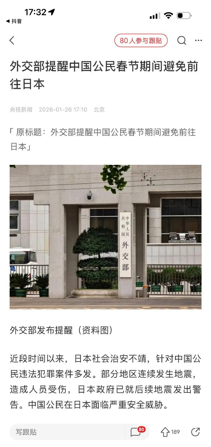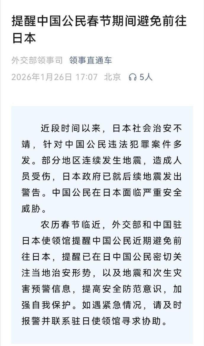 【49条中日航线取消全部航班】 我觉得,中日之间的关系,从长久来看,关键词应该是和平、贸易、文化交流。一段时间以来,出现了一定程度的相互抵制和对抗。从短期来看,比较现实的方向,应该是先恢复到政冷经热的状态。 外交部提醒中国公民春节期间避免前往日本 。航班管家数据显示,截至1月26日,2026年2月已有49条航线取消全部航班,比一月进一步增加。 2026年1月,中国大陆赴日本航班取消率达47.2%,较2025年12月增长7.8个百分点。