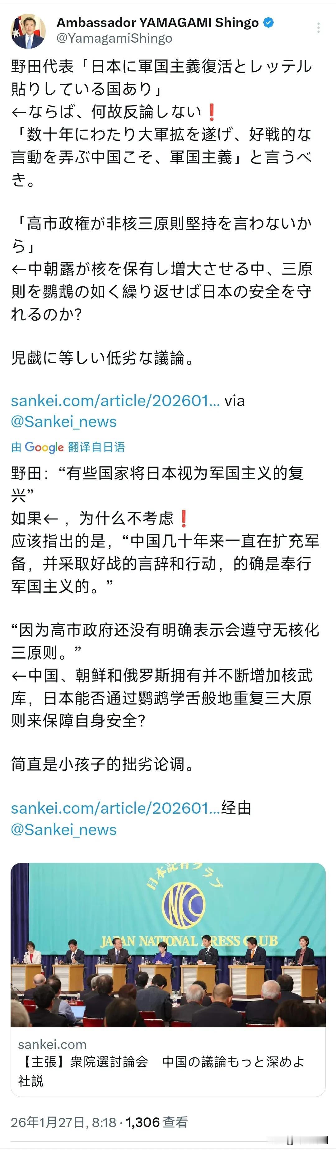 日本驻澳大利亚大使山上信吾今天(1月27日)叫嚣道:“野田佳彦代表:有些国家给日本贴上军国主义复活的标签 ←那为什么不反驳❗ ‘几十年来进行大规模军备扩张、玩弄好战言行的中国,才是军国主义’。 ‘因为高市早苗政权没有说坚持无核三原则。’ 在中朝俄拥有并扩大核武器的情况下,像鹦鹉一样重复三原则就能保护日本的安全吗? 近乎儿戏的低劣议论。” 评几句: 日驻澳大使狂言,贼喊捉贼的双标嘴脸暴露无遗 日本驻澳大使一番狂言,堪称贼喊捉贼的典型!倒打一耙称中国是“军国主义”,还嘲讽坚持无核三原则是儿戏,这番不当言论,彻底暴露日本右翼歪曲事实、妄图突破防务底线的真面目。 中国始终坚持防御性国防政策,军备发展只为维护国家主权和领土完整,何来军国主义?反观日本,防卫预算连续14年暴涨,研发高超音速导弹、更名宇宙自卫队,持续突破战后防卫底线,这才是实打实的军备扩张! 更矛盾的是,高市早苗政权本就回避坚守无核三原则,该大使却拿核安全说事,无非是为日本动摇无核三原则、谋求核武找借口。自身不断突破防务红线,却肆意污蔑他国,双标行径令人不齿。 野田佳彦的质疑何来低劣可言?坚守无核三原则是日本战后底线,更是地区安全共识。其此番狂言,绝非言论自由,而是为日本突破战后底线张目,是对东北亚地区和平的公然挑衅。 颠倒黑白终究站不住脚,日本右翼若执意突破战后底线、无视地区和平共识,最终只会自食恶果!