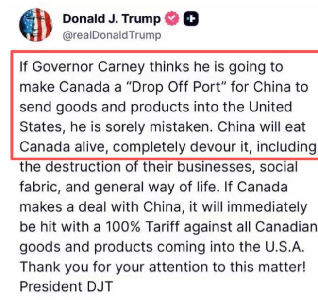 脸面都不要了!   特朗普发文说:“这个世界最不需要的,就是让中国吞并加拿大。这事绝不会发生,连一丁点可能性都没有!感谢各位关注此事。”   最近,特朗普居然声称中国正在试图“吞并”加拿大,这完全是毫无根据的荒谬之谈,事实上,中国和加拿大一直保持着正常的贸易关系,双方在农业、清洁能源等多个领域都有着互利共赢的合作。   咱就先掰扯掰扯,这话有多离谱,稍微有点常识的人都能看出来,纯属特朗普自己脑补出来的戏码,说白了就是为了博眼球、泄私愤,连最基本的脸面都顾不上了。   就在今年1月中旬,加拿大总理卡尼刚带着一堆内阁部长来中国访问,这可是2017年之后加拿大总理第一次访华,双方坐下来谈得那叫一个投机,国家主席习近平接见了他,国务院总理李强还和他举行了会谈,最后不光发表了联合声明,还签了8个合作文件,涵盖经贸、能源、农林、文旅好多方面。要是中国真要吞并加拿大,人家总理能带着团队主动上门谈合作?这不纯纯闹笑话吗?   而且中加之间的合作从来都是实打实的互利共赢,不是嘴上说说的虚头巴脑。农业方面,之前因为关税问题,双方闹过一点小波折,2024年加拿大对中国电动车加征100%关税,中国也对加拿大的菜籽油、豌豆这些农产品加了税,结果加拿大农业大省亏得底朝天,地方长官都公开呼吁赶紧修复对华关系。现在好了,双方达成共识,中国要把加拿大油菜籽进口综合税率降到大概15%,还会取消龙虾、蟹类这些水产品的反倾销措施,加拿大农民终于能松口气,不用再担心农产品卖不出去。   能源领域的合作更不用说,加拿大是世界第四大石油生产国,能源资源多到用不完,而中国是最大的能源消费国和进口国,双方刚好互补。自从2024年6月加拿大跨山原油管道扩建完成后,每天平均向中国出口20.7万桶原油,中国早就成了这条管道最大的买家。这次访华,双方还约定要启动部长级能源对话,不光要加强传统能源合作,清洁和核能领域也要深化往来,连民用核能的天然铀贸易都安排上了,这哪像是要“吞并”的样子?   更有意思的是,特朗普8天前还不是这么说的,当时中加刚宣布达成经贸共识,他还公开表示“能和中国达成协议是好事,应该去做”。结果才过了几天,他就180度大转弯,不光造谣中国要吞并加拿大,还威胁要对所有进入美国的加拿大商品加征100%关税,甚至把加拿大总理卡尼叫成“州长”,仿佛加拿大本来就是美国的一个州。这种说变就变的操作,连西方人都看懵了,不少网友都吐槽他没有一致性,没有原则,只有即兴发挥的威胁。   说到底,特朗普之所以突然发疯造谣,核心就是因为加拿大不想再被美国拿捏了。长期以来,加拿大经济对美国依赖度极高,对美出口占了总出口的75%左右,可特朗普上台后动不动就威胁加税,把加拿大的钢铁、铝、木材等行业折腾得够呛。现在加拿大总理卡尼想通了,要搞贸易多元化,摆脱对美国的过度依赖,不光和中国深化合作,还计划访问印度、澳大利亚,这可把特朗普给惹毛了。   尤其是在达沃斯论坛上,卡尼公开批评美国霸权,说基于规则的旧秩序正在消退,还呼吁中等国家联合起来,别被大国霸凌,这番话赢得了全场长时间的掌声,却让特朗普怒火中烧。他觉得加拿大脱离了自己的掌控,于是就想出了“中国吞并加拿大”这种荒唐说法,一方面是想抹黑中国,另一方面是想恐吓加拿大,逼它回到美国的怀抱里。   可加拿大根本不吃这一套,卡尼直接回应,和中国的合作完全符合美墨加协定,不存在所谓的自由贸易协定,只是解决关税问题的务实安排。加拿大外交部更是明确表示,就算美国威胁加税,也不会放弃贸易多元化的努力,能源部长还专门去了印度,谈关键矿产和液化天然气的合作。毕竟加拿大民众心里跟明镜似的,超过半数人支持和中国加强贸易关系,七成以上的人愿意为了减少对美依赖,接受暂时的经济增长放缓。   反过来瞅瞅特朗普,为了一己私欲,连最基本的事实都不顾,编造出如此离谱的谣言,不光丢了自己的脸,也让美国的国际形象受损。真正想吞并别人领土的,恐怕是他自己吧?之前他就想吞并格陵兰岛,还说加拿大的存在全靠美国,现在又造谣中国,这种操作简直让人笑掉大牙。中国一直主张国与国之间平等相待、互利共赢,和加拿大的合作从来都是光明正大,特朗普的谣言,不过是跳梁小丑的自导自演罢了,除了博人一笑,根本没有任何意义。