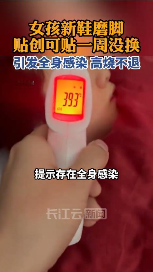 “悲剧还是发生了!”近日,一女孩突然连续数日高烧不退,体温高达39度多,家长吃药不见好后,送往医院,检查竟发现女孩体内白细胞异常,诊断为全身感染,但一直没有找到原因,直到护士揭开女孩脚上的创口贴,才找到病因。网友:贴创口贴还能感染? 很多时候买的新鞋,在一开始穿的时候都会有些不适应,大多数都存在脚跟处磨脚的情况,一般都会选择贴个创口贴适应一下。 据媒体1月27日报道,一周前,小花母亲给她买了双新鞋,可是小花只穿了一天就把脚跟处磨破了,母亲见状,便给她贴了个创口贴,由于对新鞋的喜欢,小花一直穿了一周。 直到前两天,小花突然开始发起高烧,家长起初也没有太在意,觉得孩子感冒发烧都是常有的事,就喂了些退烧药。但是小花的高烧一直没有好转的迹象,总是反反复复,烧到39度多。 家长见状也不敢再耽搁,抓紧领孩子去了医院,经过检查发现小花体内白细胞显著升高,存在全身感染,但还未确诊感染源。直到第二天护士查房时,意外发现了小花脚上的创口贴,撕开后,后脚跟处已经严重脓肿,询问后才得知这个创可贴贴了一周了,是防止鞋磨脚贴的。 医生表示,鞋子磨破脚后,细菌在创口贴提供的密闭环境下迅速繁殖,最终入血,导致全身感染。随后,医生为小花处理脚上伤口后,小花的体温也明显下降,回归正常 由此可见,小伤口如果处理不当很有可能变成大问题。同时也提醒家长当发现孩子出现高烧时,一定要仔细检查孩子身上是否存在伤口感染的情况。 信息来源:《女孩贴创可贴一周没换,引发全身感染》长江云新闻