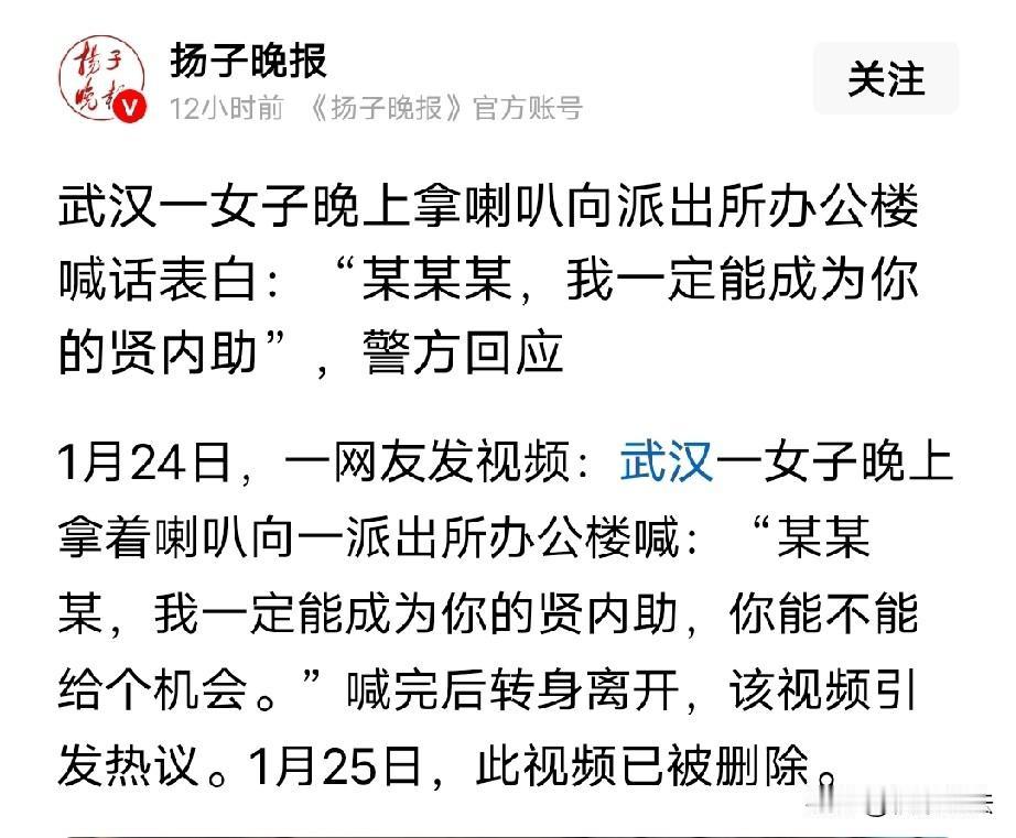 “为爱痴狂?”武汉,女子大晚上拿个喇叭,冲派出所大喊:谁谁谁,我一定能成为你的贤内助,你能不能给个机会?事情一发酵,网上视频被删除,这事网友看法分成两派…… 可以从视频中看到,女子穿着白色羽绒服,背着米色斜挎包,穿着白靴子,身材匀称,长头发,看样子大概也就20多岁。 她手里拿着喇叭,冲着派出所的办公楼大声“表白”。 喊完那些话,她就走了。 这一幕被人发到网上,没想到发酵了,后来视频删除了。 1月26号,记者就此事去该派出所核实,对方表示,女子是本地人,这事需要领导来回应。 另一个工作人员表示,让问分局,但分局的工作人员说不清楚这事。 对于这件事,网友说,女孩大胆示爱人民警察,没问题啊,做好人民警察的贤内助,让人民警察可以更好地为人民服务。这个女孩,是位心地善良的。 好事情呀,说明咱们的人民警察很优秀,这个女同志性情豪爽,有爱就大胆的说出来。 人家晚上去的,并没影响派出所正常工作,男女都未婚的话,表白几句就走并无不妥。 为爱她也拼了,说明民警很好很受欢迎。不支持女子大胆为爱影响他人工作,会吓坏人家,个人私事还是私下妥善处理好。 女子告白也正常,人家男女小青年双方的事,算不上寻衅滋事,我们年轻的时候也有女子追到单位门口几次要硬要嫁男,后来也成功了,该女子很能干,婚后开了服装店和烟酒店,生了一女一子,有大别墅和门面房,一家生活很幸福,该男子常说,我家老婆当家,我一辈子就是吃好玩好。 不过,也有网友觉得不妥,这样对公职人员表白,好像也不大好,特别还是在单位楼下,视频一旦发酵,对单位的影响是非常大的,做事情还是要考虑后果。 这种人自认为率性、直爽,是非常冒犯的,明显对方拒绝过,这是造舆论绑架对方,对于对方造成了打扰,非常讨厌。这不是校园里,在相对封闭的象牙塔中,大家都是年轻人,成不成,难堪不难堪,几年后一毕业也就烟消云散了。 个人觉得,这事儿看着挺“浪漫”,其实特别“出格”。 首先,表白没问题,但得分一下场合。派出所是办公的地方,大晚上拿个大喇叭在楼下喊,不仅吵到民警值班休息,还扰民。这并不深情。 其次,这女的喊的是“我要当你贤内助”,听着挺感人,其实是在搞“情感绑架”。搞的这事儿发网上,给对方造成挺大压力的,弄不好就成了单位里的“显眼包”了,成为大家笑料,多影响人家啊。 这事你说让警方怎么回应?毕竟是私事,但也怕这股风带坏了——今天你拿喇叭表白,明天他拿喇叭讨债,派出所成什么了? 谈恋爱是两个人的事,别拿到大街上来演。这种自我感动的“社死式浪漫”,除了尴尬,啥也留不下。 真喜欢人家,就私下里去表白,去行动,好好说,别这么出格,毕竟大家都是成年人的,为爱痴狂可以理解,但做事稳妥一点,有点分寸,多考虑一下对方的感受,别太冲动了。