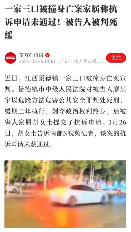 景德镇一家三口被撞案家属抗诉被驳回了 其实开过车的人都知道,限速40的路段,开到129码,那就是主观性的直接,是主观直接故意。 开过车的也知道,司机看到障碍物的避让,是开车的肌肉本能罢了,是为了自己不出事故。 他的自首是反正也逃不到哪里去的摆烂,真实心理则是和朋友冷血调侃“婴儿头真硬”,而他的父称惨剧为“天灾”。 一家人毫无悔过之心。