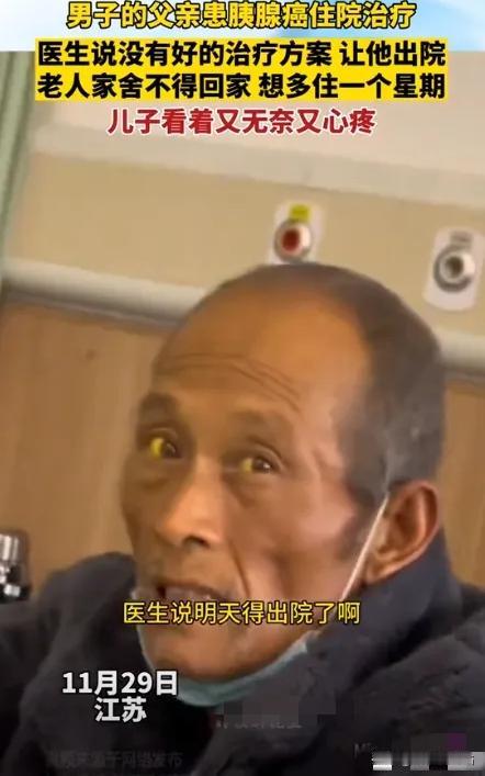“这就是穷人的悲哀!”2023年11月,江苏一大爷确诊为胰腺癌,医生劝他回家该吃吃该喝喝,老人却哀求儿子再给他交几天住院费,他不想回家等死。可这个病不但治不好,更多的钱也拿不出来,儿子只能拒绝了父亲的请求,大爷被拒后,发黄的双眼无神地看着空气,让人十分心疼。 2023年深秋,风带着一股子萧瑟的凉意,在那家医院的病房里,空气像凝固了一样,混杂着消毒水的刺鼻味,和一种让人喘不过气的绝望。 “爸,真不是我不给你治,是……是治不了了,咱家,也没钱了。” 儿子小李说这话的时候,头不敢抬起来,两只手死死攥着衣角,指节都发白了,听到这句话,病床上的周大爷没有闹,也没有哭。 他只是那双原本还带着一丝浑浊期盼的眼睛,像是被突然掐灭的蜡烛,瞬间灰了下去,他直勾勾地盯着天花板,眼珠子一动不动,枯黄浑浊,没了半点生气。 就在几分钟前,医生把检查结果摊开了说,直白得近乎残忍:“胰腺癌晚期,扩散得哪儿都是了,老人家,说句实话,现在的医疗手段意义不大了,回家吧,想吃点啥就吃点啥,别在医院遭罪了。” 这道理,其实谁都懂,胰腺癌这东西,号称“癌中之王”,发现大概率就是晚期,花钱如流水,最后往往是人财两空。 但周大爷不想懂,或者说,求生欲让他本能地抗拒这个宣判,他那双枯瘦如柴的手,死死抓着那条洗得发硬的床单,手背上青筋暴起。 他几乎是在哀求,声音颤抖着跟儿子说:“再住几天行不?就几天……在这儿我有底,我不怕,一回家,我就觉得我要完了。” 那是一个老人面对即将到来的终点时,最原始的恐惧,他怕的不是回家,而是怕那种被放弃、只能等死的绝望。 小李僵在那儿,不敢看父亲的脸,他兜里那张皱巴巴的缴费单上,数字刺眼得像针扎,他只是个普通的打工仔,老婆孩子要养,房贷要还,母亲走得早,这些年和父亲相依为命,家底本来就薄。 为了这次确诊检查,家里那点积蓄,已经像水一样流出去了,他心里有本账,算得清清楚楚,也算得心如刀割:留在医院,哪怕只是打打营养针、止痛针,每天的费用也是个无底洞。 这不仅仅是钱的事儿,更是拿全家未来的活路,去换父亲在病床上多躺几天、多受几天罪,这是一道无解的题,一边是生养自己的老父亲,一边是还得继续过日子的老婆孩子。 小李最终还是硬起了心肠,眼泪在眼眶里打转,咬着牙把那句最残忍的话说了出来:“爸,走吧,咱回家。” 这句话一出口,就像是一把刀,彻底割断了周大爷眼里的最后一丝光亮。 回想起来,全是让人拍大腿的遗憾,周大爷是个老实巴交的农民,一辈子不舍得吃不舍得穿,把自己当牲口使。 前两年肚子隐隐作痛,他总觉得是着凉了、吃坏了,为了省那几百块钱检查费,硬是两片止痛药就扛过去。 他怕花钱,更怕给在外打工的儿子添麻烦,直到疼得在炕上打滚,实在扛不住了才被架到医院,可这时候,命已经被拖到了悬崖边上。 出院那天,天阴沉沉的,小李推着轮椅,轮椅上的周大爷身上盖着那床家里带来的旧棉被,显得格外瘦小。 路过缴费大厅的时候,人来人往,热闹得很,但周大爷一眼都没看,甚至没回头看一眼,那个他想留却留不下的病房。 他缩在轮椅里,那双发黄的眼睛,死死盯着医院大门外那棵光秃秃的树,眼神空洞得像个黑洞。 那一刻,没人知道他在想什么,或许是在怨儿子的狠心,或许是在悔自己当年的节省,又或许,他只是在跟这个世界做最后的、无声的告别。 在这场与死神的博弈里,对于像他们这样的普通家庭来说,甚至连上牌桌的资格都没有,就被昂贵的入场费挡在了门外,回家,成了唯一的退路。