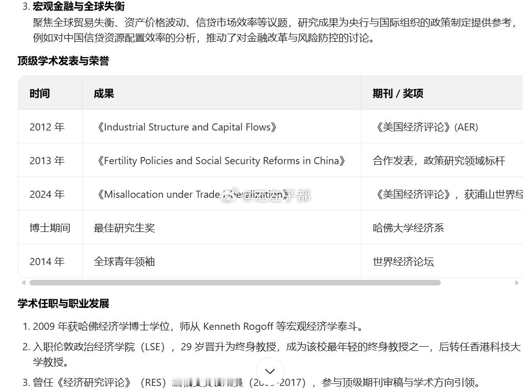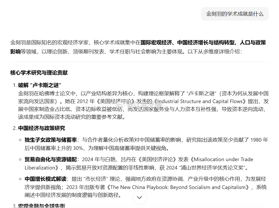 问大模型金刻羽的学术成就是什么?大模型总结:金刻羽的学术成就以理论创新(卢卡斯之谜、市长经济)、顶级发表(AER 等)、政策影响(全球失衡、中国改革) 为核心,兼具学术深度与现实意义,是新生代华人经济学家在国际学界的代表人物之一。这算吗?