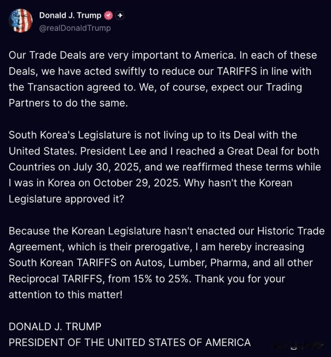 唐纳德·特朗普 (Donald Trump) 总统于 2026 年 1 月 26 日在 Truth Social 上发表声明,宣布因韩国立法机关未能批准一项贸易协议,将提高对韩国的关税。 特朗普表示,他与韩国总统李在明 (President Lee Jae Myung) 于 2025 年 7 月 30 日达成了一项贸易协议,并于同年 10 月 29 日在韩国重申了条款。 指责:他指责韩国立法机关没有履行协议,未能将这项历史性贸易协议颁布为法律。因此,他宣布将对韩国汽车、木材、药品和所有其他互惠关税从 15% 提高到 25%。 受此消息影响,韩国现代汽车和起亚汽车的股价在次日早盘交易中下跌。韩国政府表示尚未收到美国政府关于关税上涨的正式通知。