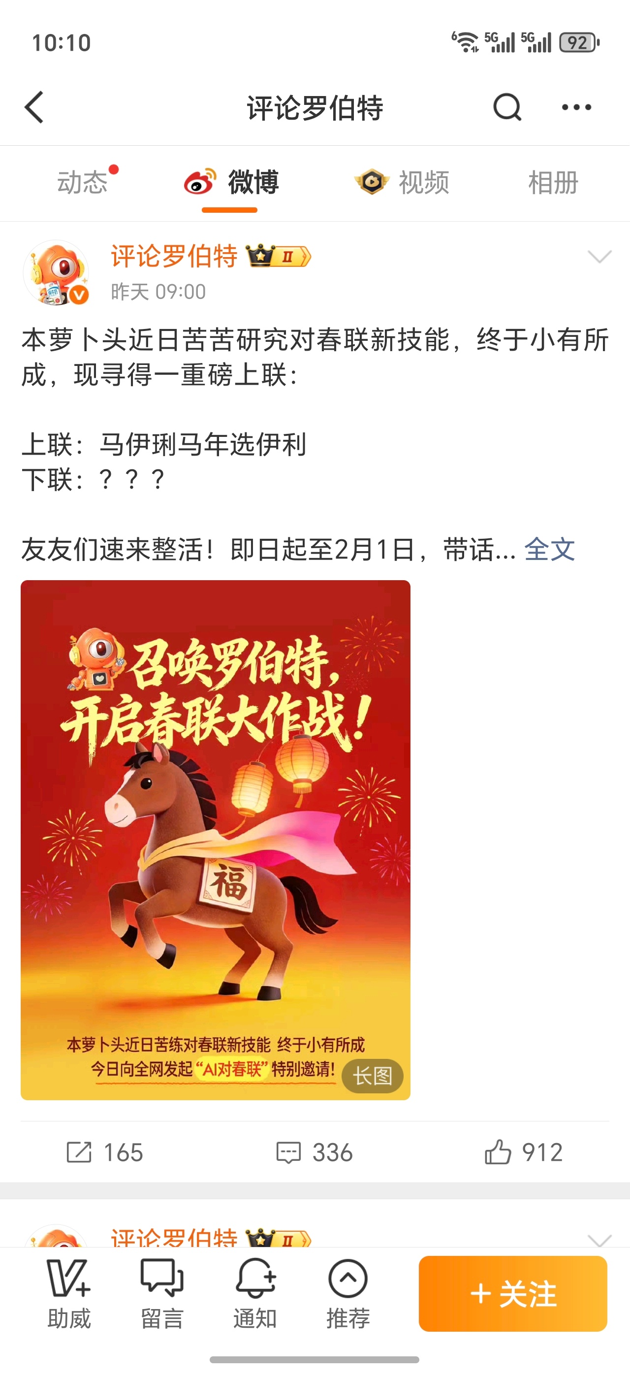 马年春联已进入AI时代要过年了,又到了绞尽脑汁的对对子环节,伊利官方出了个很好玩的上联,“马伊琍马年选伊利”,谐音梗和马年元素完美融合,天才!不过不用慌,这种事情让AI 来帮你,听说他对出来的对子又好听又有梗,可以被评为新时代的对王之王!有的工整,有的玩梗,有的温馨,花样百出的下联看得人眼花缭乱!不得不说,这波上联真的赢麻了,承包了我今天的笑点,火速出来对对子!