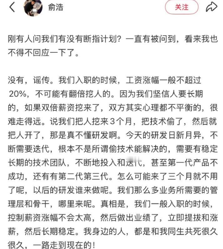 刚刚!追觅俞浩首度回应“断指计划”! 追觅科技创始人兼 CEO 俞浩在社交媒体发文,首次回应“断指计划”传闻:刚有人问我们有没有断指计划?一直有被问到,看来我也不得不回应一下了。没有,谣传。我们入职的时候,工资涨幅一般不超过 20%,不可能有翻倍挖人的。