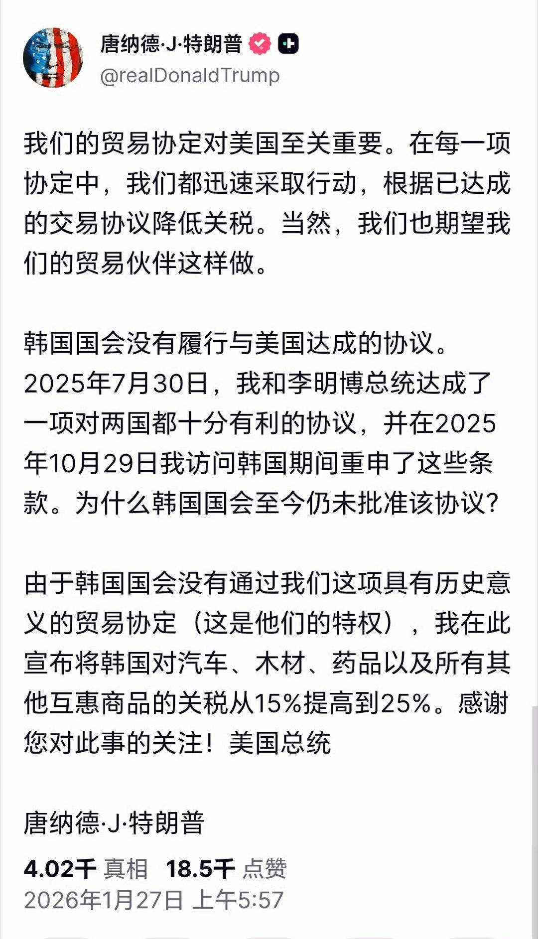 韩国人一觉醒来就看到不好的消息、特朗普又要增加关税 特朗普发文称,鉴于韩国方面尚未通过该项“具有历史意义的贸易协议”,他已决定将对韩国汽车、木材、制药产品以及其他对等关税项目的税率从15%上调至25%。美将对韩汽车等加征25%关税